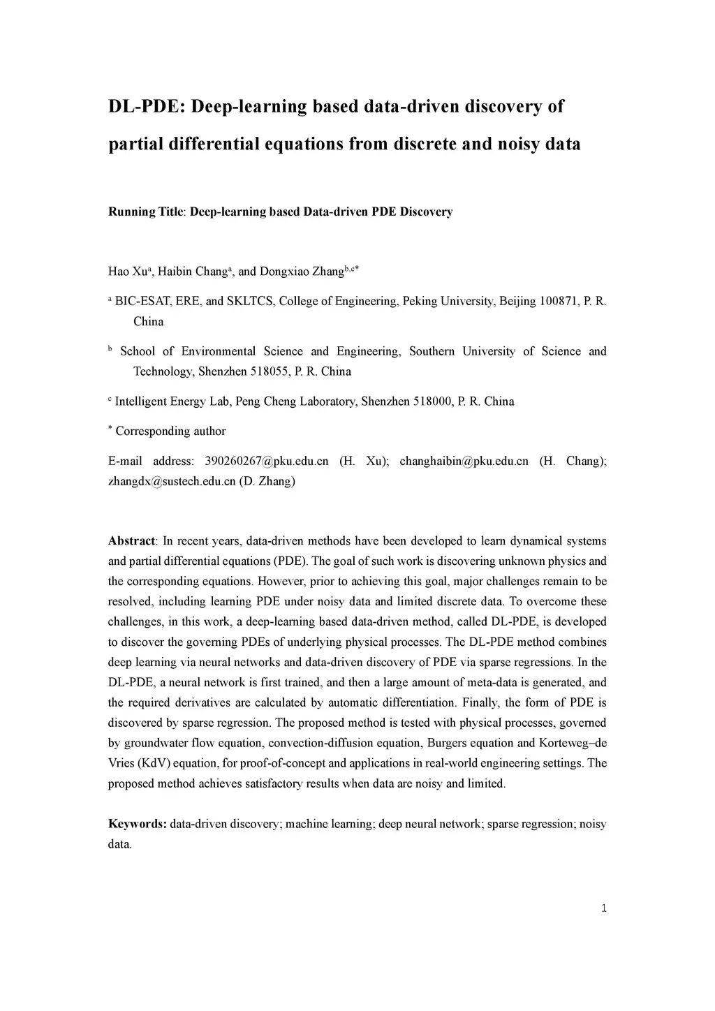In recent years, data-driven methods have been developed to learn dynamical systems and partial differential equations (PDE). The goal of such work is discovering unknown physics and the corresponding equations. However, prior to achieving this goal, major challenges remain to be resolved, including learning PDE under noisy data and limited discrete data. To overcome these challenges, in this work, a deep-learning based data-driven method, called DL-PDE, is developed to discover the governing PDEs of underlying physical processes. The DL-PDE method combines deep learning via neural networks and data-driven discovery of PDE via sparse regressions. In the DL-PDE, a neural network is first trained, and then a large amount of meta-data is generated, and the required derivatives are calculated by automatic differentiation. Finally, the form of PDE is discovered by sparse regression. The proposed method is tested with physical processes, governed by groundwater flow equation, convection-diffusion equation, Burgers equation and Korteweg-de Vries (KdV) equation, for proof-of-concept and applications in real-world engineering settings. The proposed method achieves satisfactory results when data are noisy and limited.