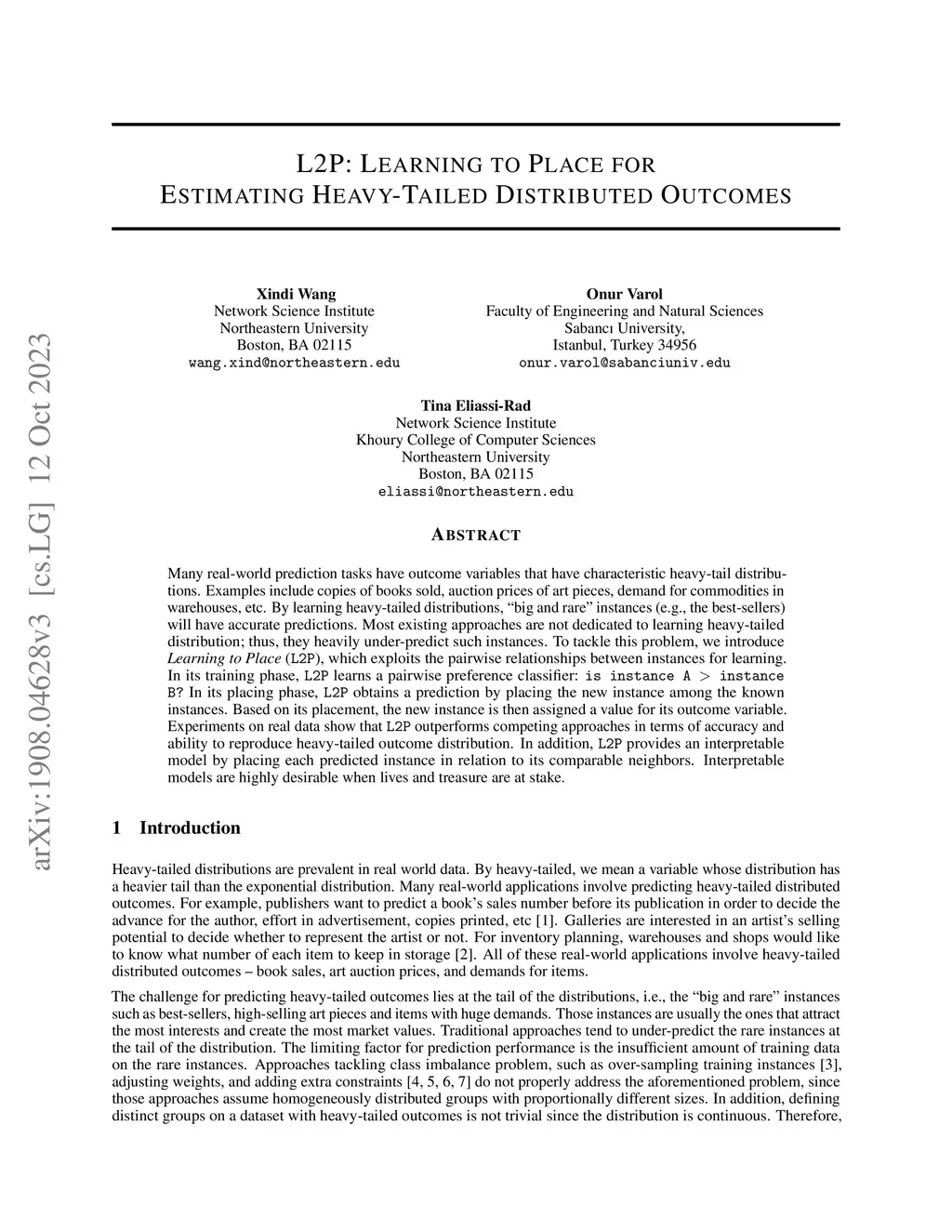 Many real-world prediction tasks have outcome (a.k.a.~target or response) variables that have characteristic heavy-tail distributions. Examples include copies of books sold, auction prices of art pieces, etc. By learning heavy-tailed distributions, ``big and rare'' instances (e.g., the best-sellers) will have accurate predictions. Most existing approaches are not dedicated to learning heavy-tailed distribution; thus, they heavily under-predict such instances. To tackle this problem, we introduce \emph{Learning to Place} (\texttt{L2P}), which exploits the pairwise relationships between instances to learn from a proportionally higher number of rare instances. \texttt{L2P} consists of two stages. In Stage 1, \texttt{L2P} learns a pairwise preference classifier: \textit{is instance A instance B?}. In Stage 2, \texttt{L2P} learns to place a new instance into an ordinal ranking of known instances. Based on its placement, the new instance is then assigned a value for its outcome variable. Experiments on real data show that \texttt{L2P} outperforms competing approaches in terms of accuracy and capability to reproduce heavy-tailed outcome distribution. In addition, \texttt{L2P} can provide an interpretable model with explainable outcomes by placing each predicted instance in context with its comparable neighbors.