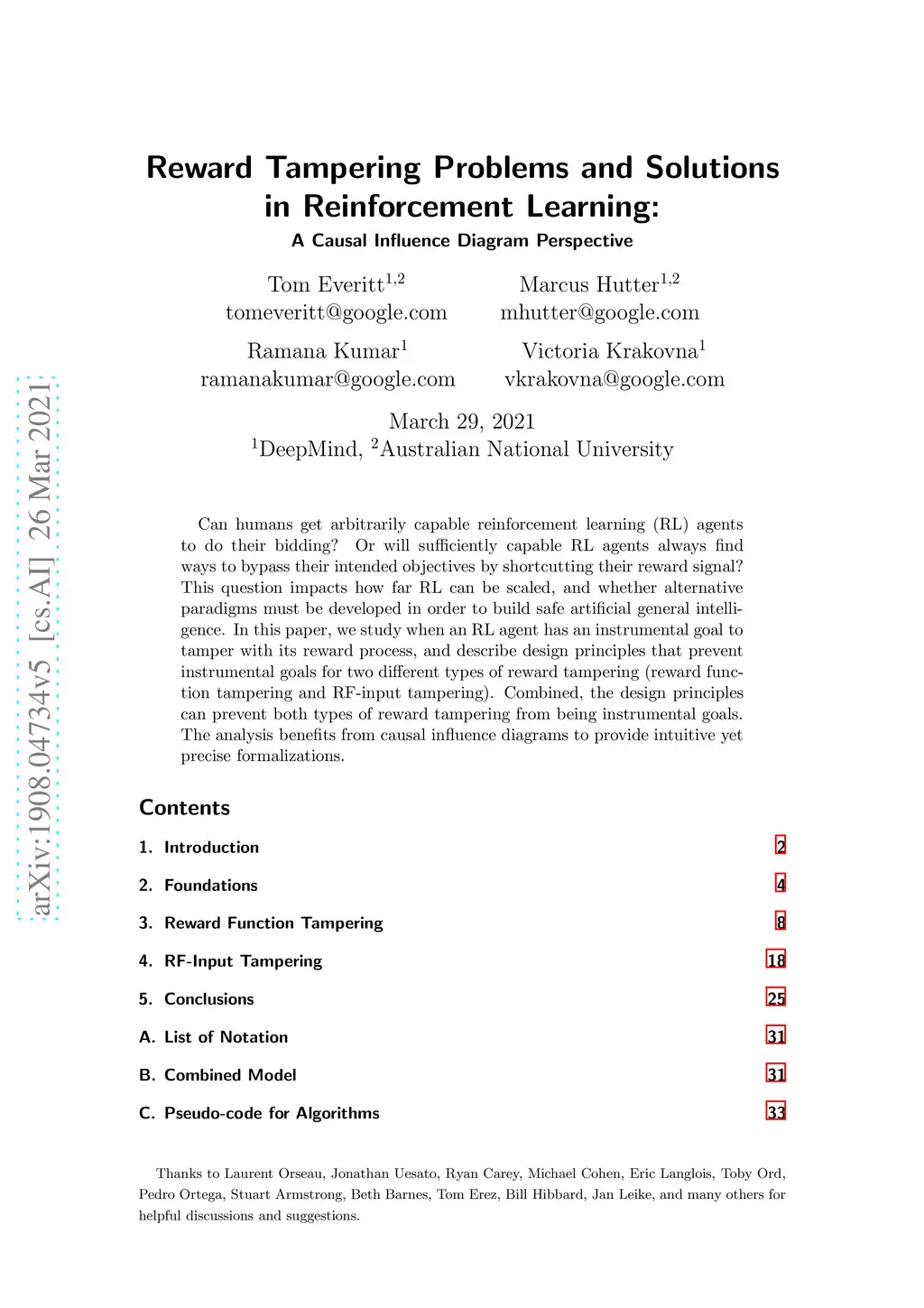 Can humans get arbitrarily capable reinforcement learning (RL) agents to do their bidding? Or will sufficiently capable RL agents always find ways to bypass their intended objectives by shortcutting their reward signal? This question impacts how far RL can be scaled, and whether alternative paradigms must be developed in order to build safe artificial general intelligence. In this paper, we study when an RL agent has an instrumental goal to tamper with its reward process, and describe design principles that prevent instrumental goals for two different types of reward tampering (reward function tampering and RF-input tampering). Combined, the design principles can prevent both types of reward tampering from being instrumental goals. The analysis benefits from causal influence diagrams to provide intuitive yet precise formalizations.