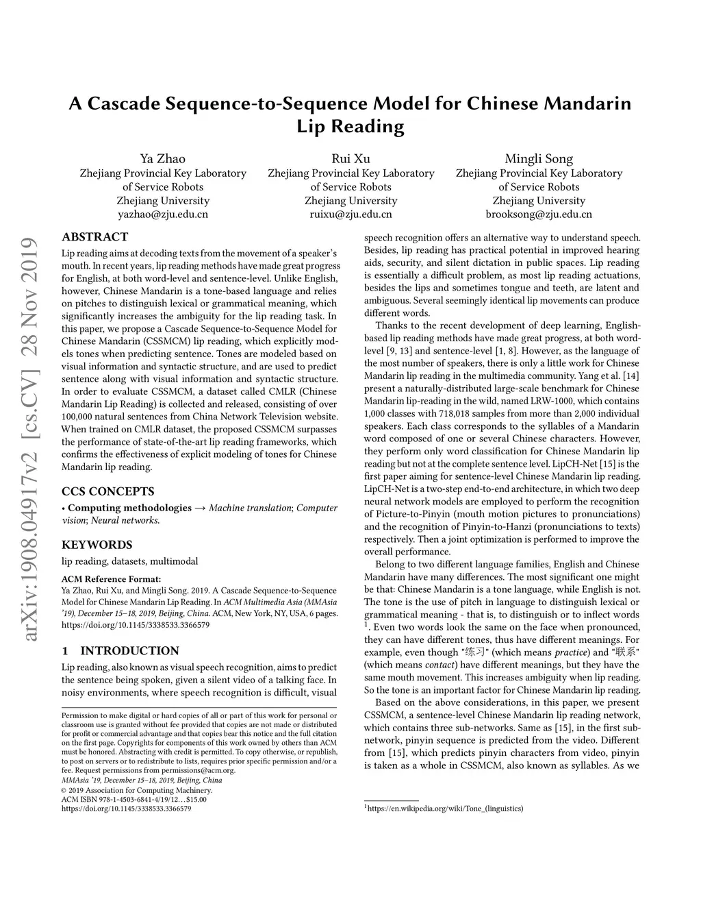 Lip reading aims at decoding texts from the movement of a speaker's mouth. In recent years, lip reading methods have made great progress for English, at both word-level and sentence-level. Unlike English, however, Chinese Mandarin is a tone-based language and relies on pitches to distinguish lexical or grammatical meaning, which significantly increases the ambiguity for the lip reading task. In this paper, we propose a Cascade Sequence-to-Sequence Model for Chinese Mandarin (CSSMCM) lip reading, which explicitly models tones when predicting sentence. Tones are modeled based on visual information and syntactic structure, and are used to predict sentence along with visual information and syntactic structure. In order to evaluate CSSMCM, a dataset called CMLR (Chinese Mandarin Lip Reading) is collected and released, consisting of over 100,000 natural sentences from China Network Television website. When trained on CMLR dataset, the proposed CSSMCM surpasses the performance of state-of-the-art lip reading frameworks, which confirms the effectiveness of explicit modeling of tones for Chinese Mandarin lip reading.