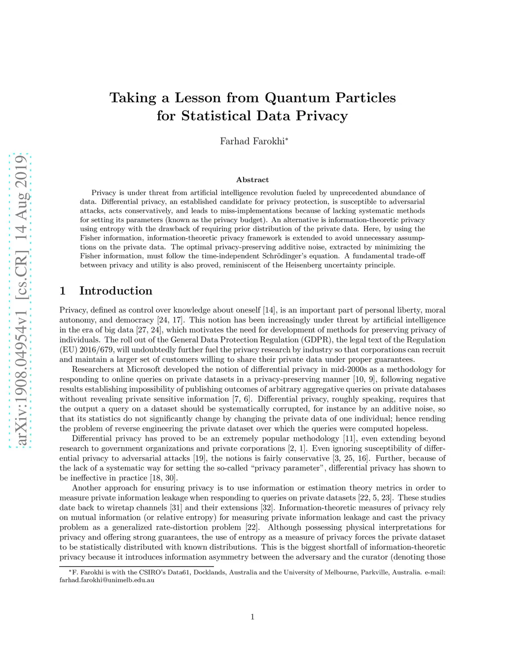 Privacy is under threat from artificial intelligence revolution fueled by unprecedented abundance of data. Differential privacy, an established candidate for privacy protection, is susceptible to adversarial attacks, acts conservatively, and leads to miss-implementations because of lacking systematic methods for setting its parameters (known as the privacy budget). An alternative is information-theoretic privacy using entropy with the drawback of requiring prior distribution of the private data. Here, by using the Fisher information, information-theoretic privacy framework is extended to avoid unnecessary assumptions on the private data. The optimal privacy-preserving additive noise, extracted by minimizing the Fisher information, must follow the time-independent Schrodinger's equation. A fundamental trade-off between privacy and utility is also proved, reminiscent of the Heisenberg uncertainty principle.