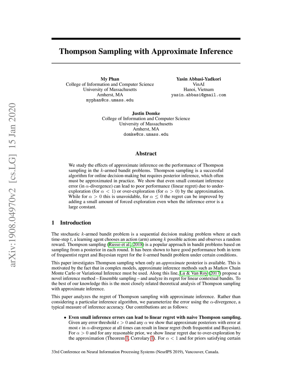 We study the effects of approximate inference on the performance of Thompson sampling in the -armed bandit problems. Thompson sampling is a successful algorithm for online decision-making but requires posterior inference, which often must be approximated in practice. We show that even small constant inference error (in -divergence) can lead to poor performance (linear regret) due to under-exploration (for ) or over-exploration (for ) by the approximation. While for this is unavoidable, for the regret can be improved by adding a small amount of forced exploration even when the inference error is a large constant.