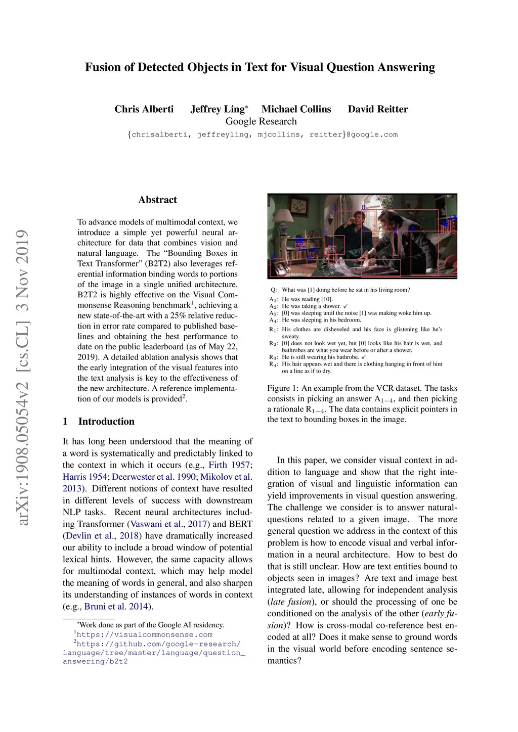 To advance models of multimodal context, we introduce a simple yet powerful neural architecture for data that combines vision and natural language. The "Bounding Boxes in Text Transformer" (B2T2) also leverages referential information binding words to portions of the image in a single unified architecture. B2T2 is highly effective on the Visual Commonsense Reasoning benchmark (visualcommonsense.com), achieving a new state-of-the-art with a 25% relative reduction in error rate compared to published baselines and obtaining the best performance to date on the public leaderboard (as of May 13, 2019). A detailed ablation analysis shows that the early integration of the visual features into the text analysis is key to the effectiveness of the new architecture.