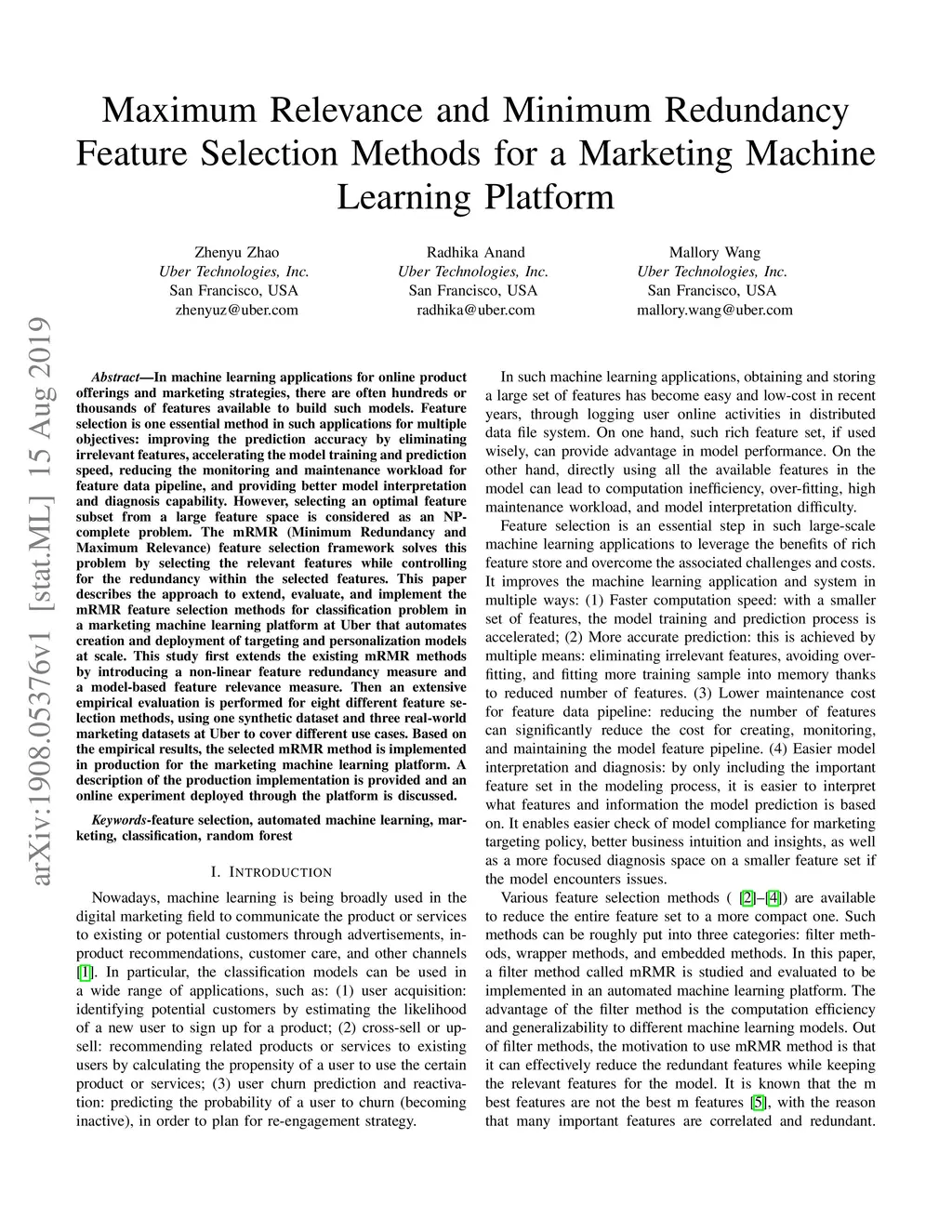 In machine learning applications for online product offerings and marketing strategies, there are often hundreds or thousands of features available to build such models. Feature selection is one essential method in such applications for multiple objectives: improving the prediction accuracy by eliminating irrelevant features, accelerating the model training and prediction speed, reducing the monitoring and maintenance workload for feature data pipeline, and providing better model interpretation and diagnosis capability. However, selecting an optimal feature subset from a large feature space is considered as an NP-complete problem. The mRMR (Minimum Redundancy and Maximum Relevance) feature selection framework solves this problem by selecting the relevant features while controlling for the redundancy within the selected features. This paper describes the approach to extend, evaluate, and implement the mRMR feature selection methods for classification problem in a marketing machine learning platform at Uber that automates creation and deployment of targeting and personalization models at scale. This study first extends the existing mRMR methods by introducing a non-linear feature redundancy measure and a model-based feature relevance measure. Then an extensive empirical evaluation is performed for eight different feature selection methods, using one synthetic dataset and three real-world marketing datasets at Uber to cover different use cases. Based on the empirical results, the selected mRMR method is implemented in production for the marketing machine learning platform. A description of the production implementation is provided and an online experiment deployed through the platform is discussed.