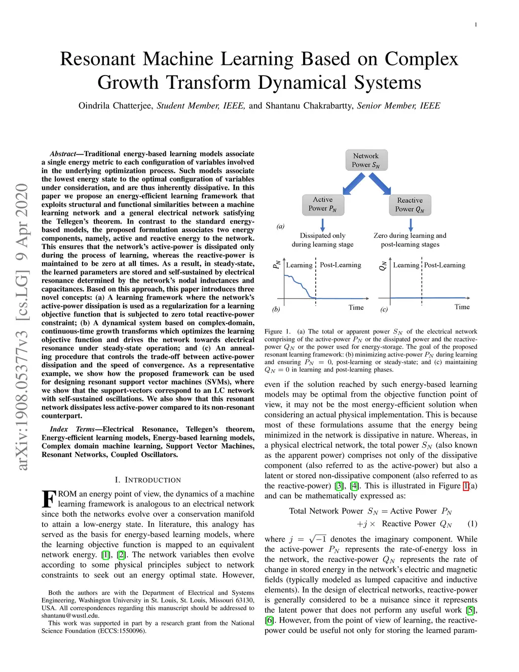 Traditional energy-based learning models associate a single energy metric to each configuration of variables involved in the underlying optimization process. Such models associate the lowest energy state to the optimal configuration of variables under consideration, and are thus inherently dissipative. In this paper we propose an energy-efficient learning framework that exploits structural and functional similarities between a machine learning network and a general electrical network satisfying the Tellegen's theorem. In contrast to the standard energy-based models, the proposed formulation associates two energy components, namely, active and reactive energy to the network. This ensures that the network's active-power is dissipated only during the process of learning, whereas the reactive-power is maintained to be zero at all times. As a result, in steady-state, the learned parameters are stored and self-sustained by electrical resonance determined by the network's nodal inductances and capacitances. Based on this approach, this paper introduces three novel concepts: (a) A learning framework where the network's active-power dissipation is used as a regularization for a learning objective function that is subjected to zero total reactive-power constraint; (b) A dynamical system based on complex-domain, continuous-time growth transforms which optimizes the learning objective function and drives the network towards electrical resonance under steady-state operation; and (c) An annealing procedure that controls the trade-off between active-power dissipation and the speed of convergence. As a representative example, we show how the proposed framework can be used for designing resonant support vector machines (SVMs), where we show that the support-vectors correspond to an LC network with self-sustained oscillations.