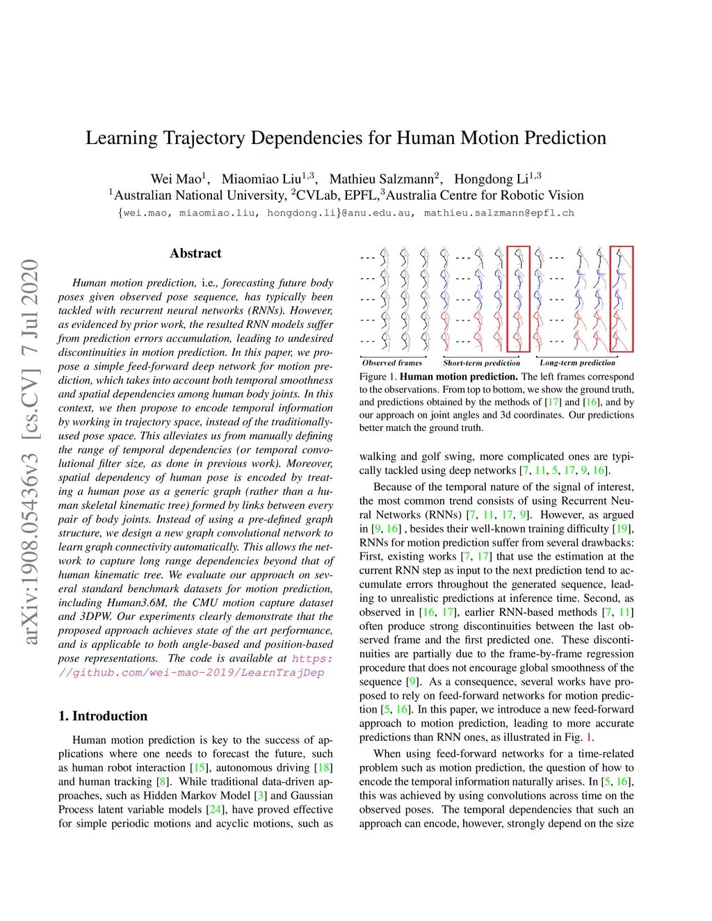 Human motion prediction, i.e., forecasting future body poses given observed pose sequence, has typically been tackled with recurrent neural networks (RNNs). However, as evidenced by prior work, the resulted RNN models suffer from prediction errors accumulation, leading to undesired discontinuities in motion prediction. In this paper, we propose a simple feed-forward deep network for motion prediction, which takes into account both temporal smoothness and spatial dependencies among human body joints. In this context, we then propose to encode temporal information by working in trajectory space, instead of the traditionally-used pose space. This alleviates us from manually defining the range of temporal dependencies (or temporal convolutional filter size, as done in previous work). Moreover, spatial dependency of human pose is encoded by treating a human pose as a generic graph (rather than a human skeletal kinematic tree) formed by links between every pair of body joints. Instead of using a pre-defined graph structure, we design a new graph convolutional network to learn graph connectivity automatically. This allows the network to capture long range dependencies beyond that of human kinematic tree. We evaluate our approach on several standard benchmark datasets for motion prediction, including Human3.6M, the CMU motion capture dataset and 3DPW. Our experiments clearly demonstrate that the proposed approach achieves state of the art performance, and is applicable to both angle-based and position-based pose representations. The code is available at https://github.com/wei-mao-2019/LearnTrajDep