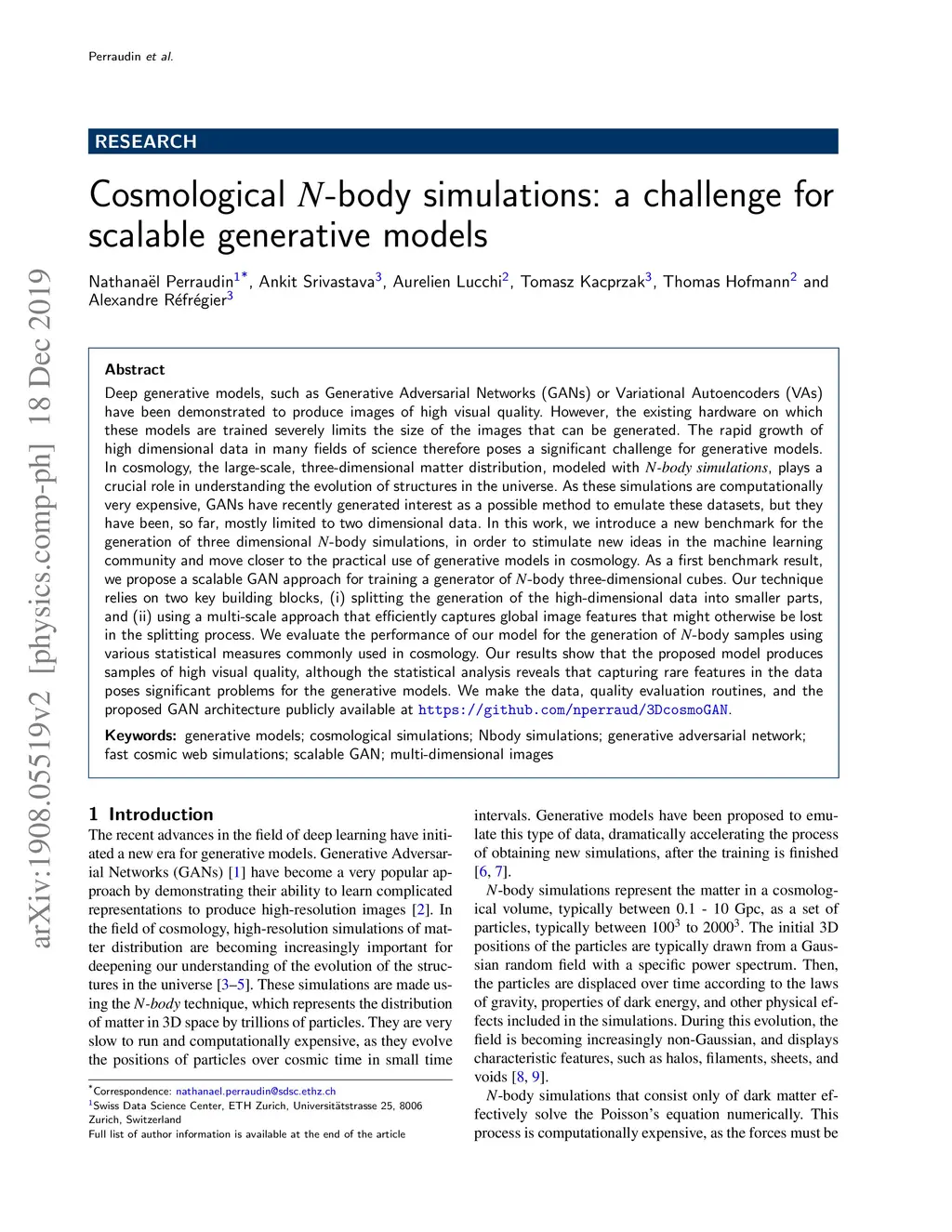 Deep generative models, such as Generative Adversarial Networks (GANs) or Variational Autoencoders (VAs) have been demonstrated to produce images of high visual quality. However, the existing hardware severely limits the size of the images that can be generated. The rapid growth of high dimensional data in many fields of science therefore poses a significant challenge for generative models. In cosmology, the large-scale, three-dimensional matter distribution, modeled with N-body simulations, plays a crucial role in understanding the evolution of the universe. As these simulations are computationally very expensive, GANs have recently generated interest as a possible method to emulate these datasets, but they have been, so far, mostly limited to two dimensional data. In this work, we introduce a new benchmark for the generation of three dimensional N-body simulations, in order to stimulate new ideas in the machine learning community and move closer to the practical use of generative models in cosmology. As a first benchmark result, we propose a scalable GAN approach for training a generator of N-body three-dimensional cubes. Our technique relies on two key building blocks, (i) splitting the generation of the high-dimensional data into smaller parts, and (ii) using a multi-scale approach that efficiently captures global image features that might otherwise be lost in the splitting process. We evaluate the performance of our model for the generation of N-body samples using various statistical measures commonly used in cosmology. Our results show that the proposed model produces samples of high visual quality, although the statistical analysis reveals that capturing rare features in the data poses significant problems for the generative models. We make the data, quality evaluation routines, and the proposed GAN architecture publicly available at https://github.com/nperraud/3DcosmoGAN
