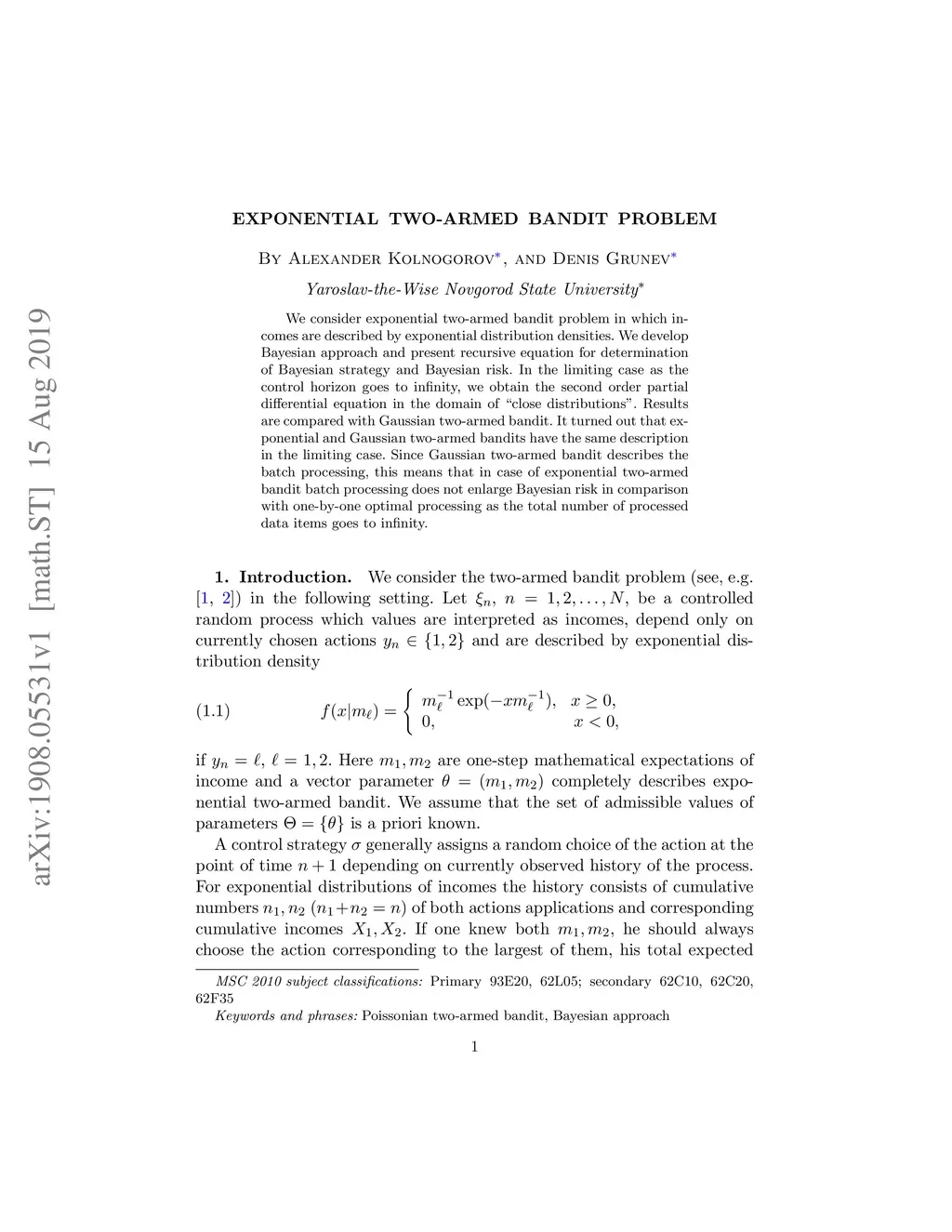 Exponential two-armed bandit problem