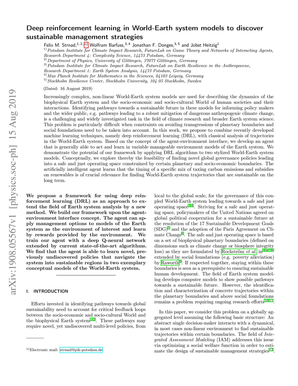 Increasingly complex, non-linear World-Earth system models are used for describing the dynamics of the biophysical Earth system and the socio-economic and socio-cultural World of human societies and their interactions. Identifying pathways towards a sustainable future in these models for informing policy makers and the wider public, e.g. pathways leading to a robust mitigation of dangerous anthropogenic climate change, is a challenging and widely investigated task in the field of climate research and broader Earth system science. This problem is particularly difficult when constraints on avoiding transgressions of planetary boundaries and social foundations need to be taken into account. In this work, we propose to combine recently developed machine learning techniques, namely deep reinforcement learning (DRL), with classical analysis of trajectories in the World-Earth system. Based on the concept of the agent-environment interface, we develop an agent that is generally able to act and learn in variable manageable environment models of the Earth system. We demonstrate the potential of our framework by applying DRL algorithms to two stylized World-Earth system models. Conceptually, we explore thereby the feasibility of finding novel global governance policies leading into a safe and just operating space constrained by certain planetary and socio-economic boundaries. The artificially intelligent agent learns that the timing of a specific mix of taxing carbon emissions and subsidies on renewables is of crucial relevance for finding World-Earth system trajectories that are sustainable on the long term.