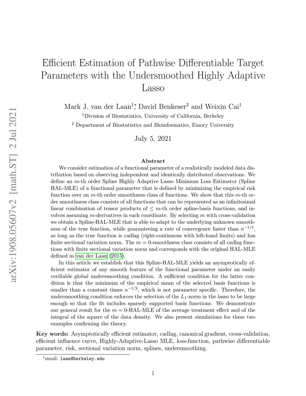 We consider estimation of a functional parameter of a realistically modeled data distribution based on observing independent and identically distributed observations. We define an -th order Spline Highly Adaptive Lasso Minimum Loss Estimator (Spline HAL-MLE) of a functional parameter that is defined by minimizing the empirical risk function over an -th order smoothness class of functions. We show that this -th order smoothness class consists of all functions that can be represented as an infinitesimal linear combination of tensor products of -th order spline-basis functions, and involves assuming -derivatives in each coordinate. By selecting with cross-validation we obtain a Spline-HAL-MLE that is able to adapt to the underlying unknown smoothness of the true function, while guaranteeing a rate of convergence faster than , as long as the true function is cadlag (right-continuous with left-hand limits) and has finite sectional variation norm. The -smoothness class consists of all cadlag functions with finite sectional variation norm and corresponds with the original HAL-MLE defined in van der Laan (2015). In this article we establish that this Spline-HAL-MLE yields an asymptotically efficient estimator of any smooth feature of the functional parameter under an easily verifiable global undersmoothing condition. A sufficient condition for the latter condition is that the minimum of the empirical mean of the selected basis functions is smaller than a constant times , which is not parameter specific and enforces the selection of the -norm in the lasso to be large enough to include sparsely supported basis. We demonstrate our general result for the -HAL-MLE of the average treatment effect and of the integral of the square of the data density. We also present simulations for these two examples confirming the theory.