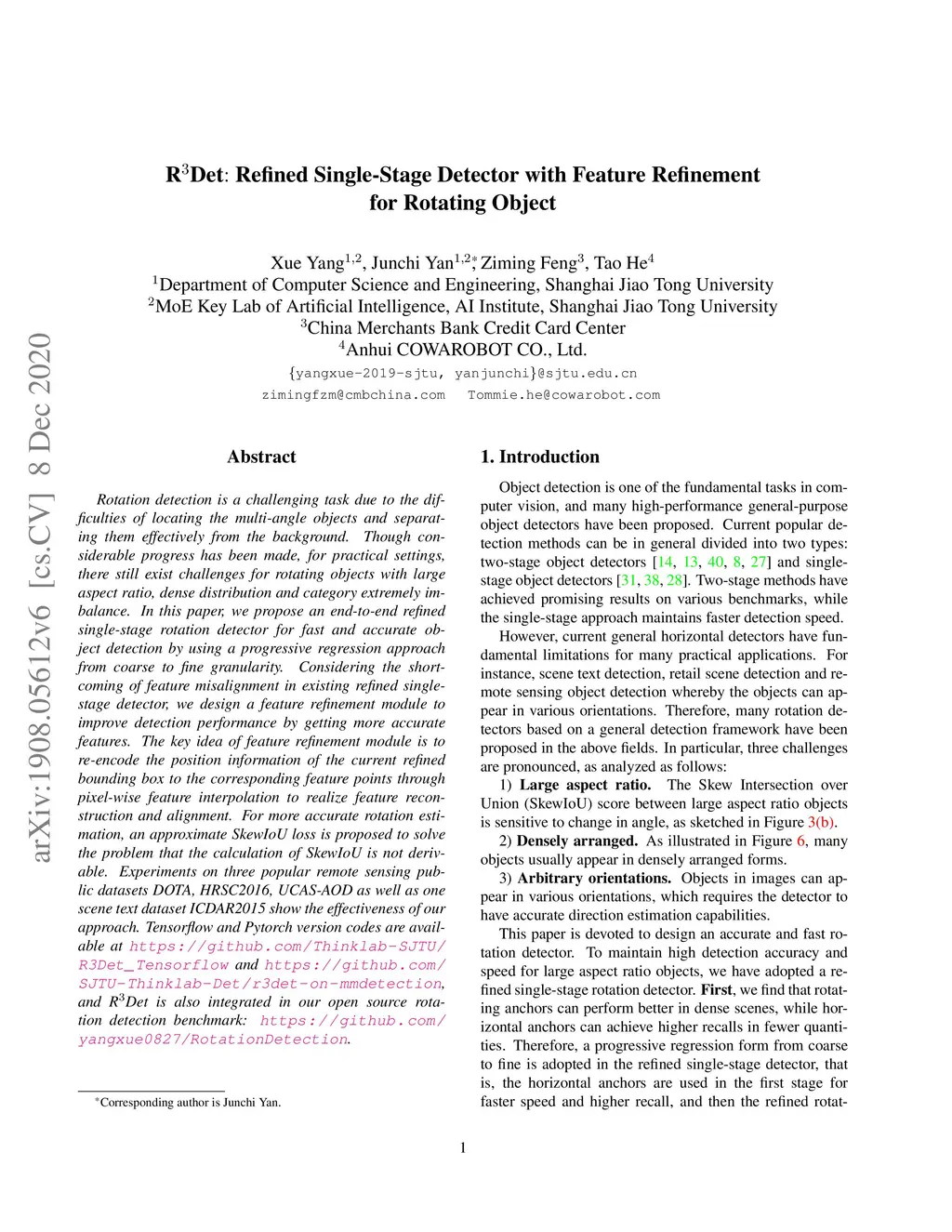 R3Det: Refined Single-Stage Detector with Feature Refinement for