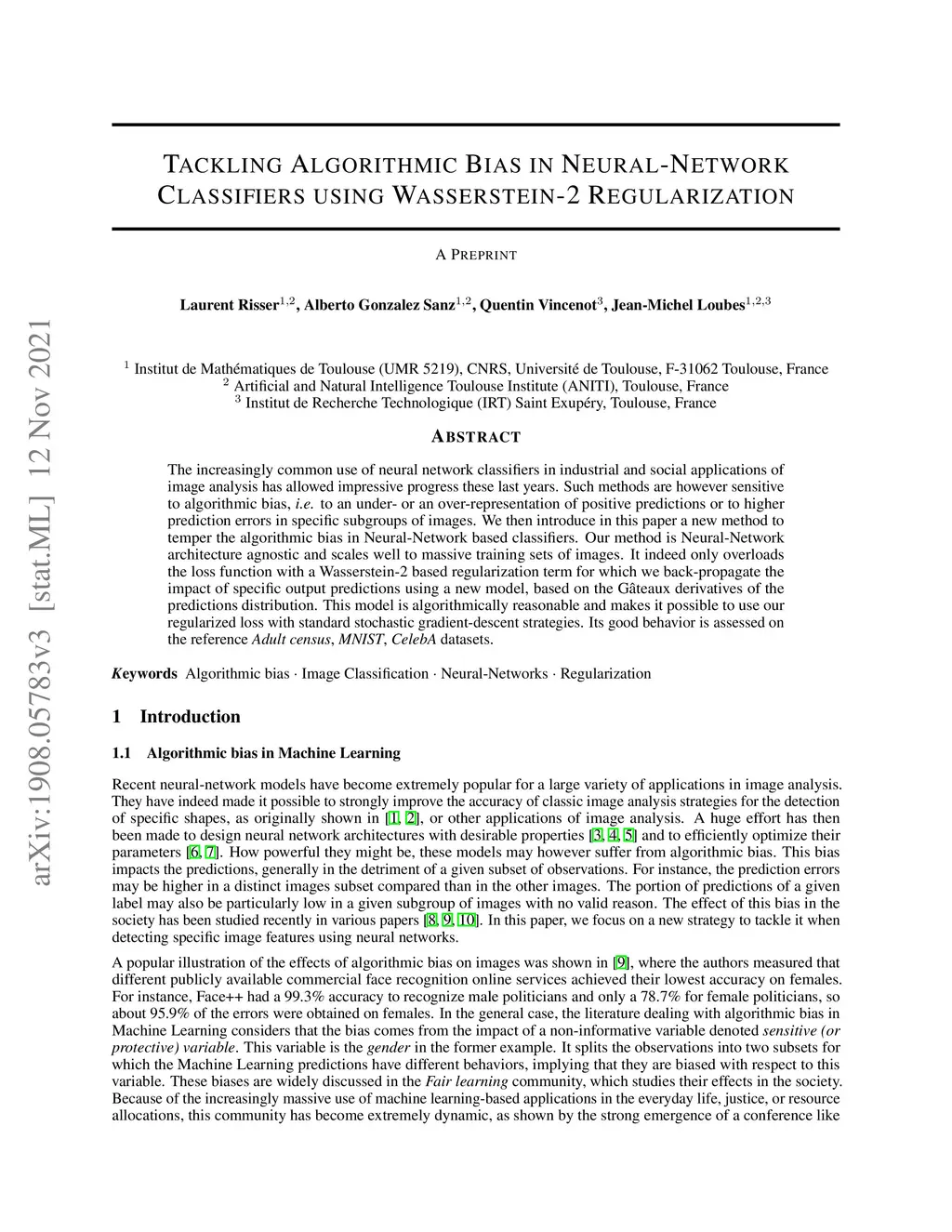 The increasingly common use of neural network classifiers in industrial and social applications of image analysis has allowed impressive progress these last years. Such methods are however sensitive to algorithmic bias, i.e. to an under- or an over-representation of positive predictions or to higher prediction errors in specific subgroups of images. We then introduce in this paper a new method to temper the algorithmic bias in Neural-Network based classifiers. Our method is Neural-Network architecture agnostic and scales well to massive training sets of images. It indeed only overloads the loss function with a Wasserstein-2 based regularization term for which we back-propagate the impact of specific output predictions using a new model, based on the Gateaux derivatives of the predictions distribution. This model is algorithmically reasonable and makes it possible to use our regularized loss with standard stochastic gradient-descent strategies. Its good behavior is assessed on the reference Adult census, MNIST, CelebA datasets.