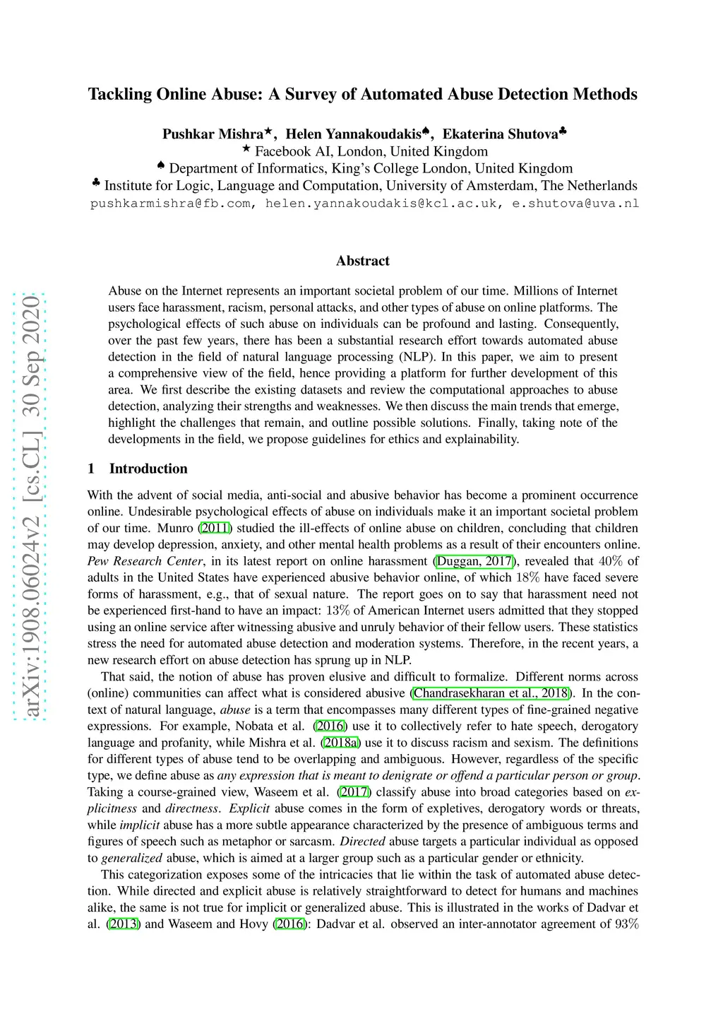 Abuse on the Internet represents an important societal problem of our time. Millions of Internet users face harassment, racism, personal attacks, and other types of abuse on online platforms. The psychological effects of such abuse on individuals can be profound and lasting. Consequently, over the past few years, there has been a substantial research effort towards automated abuse detection in the field of natural language processing (NLP). In this paper, we present a comprehensive survey of the methods that have been proposed to date, thus providing a platform for further development of this area. We describe the existing datasets and review the computational approaches to abuse detection, analyzing their strengths and limitations. We discuss the main trends that emerge, highlight the challenges that remain, outline possible solutions, and propose guidelines for ethics and explainability