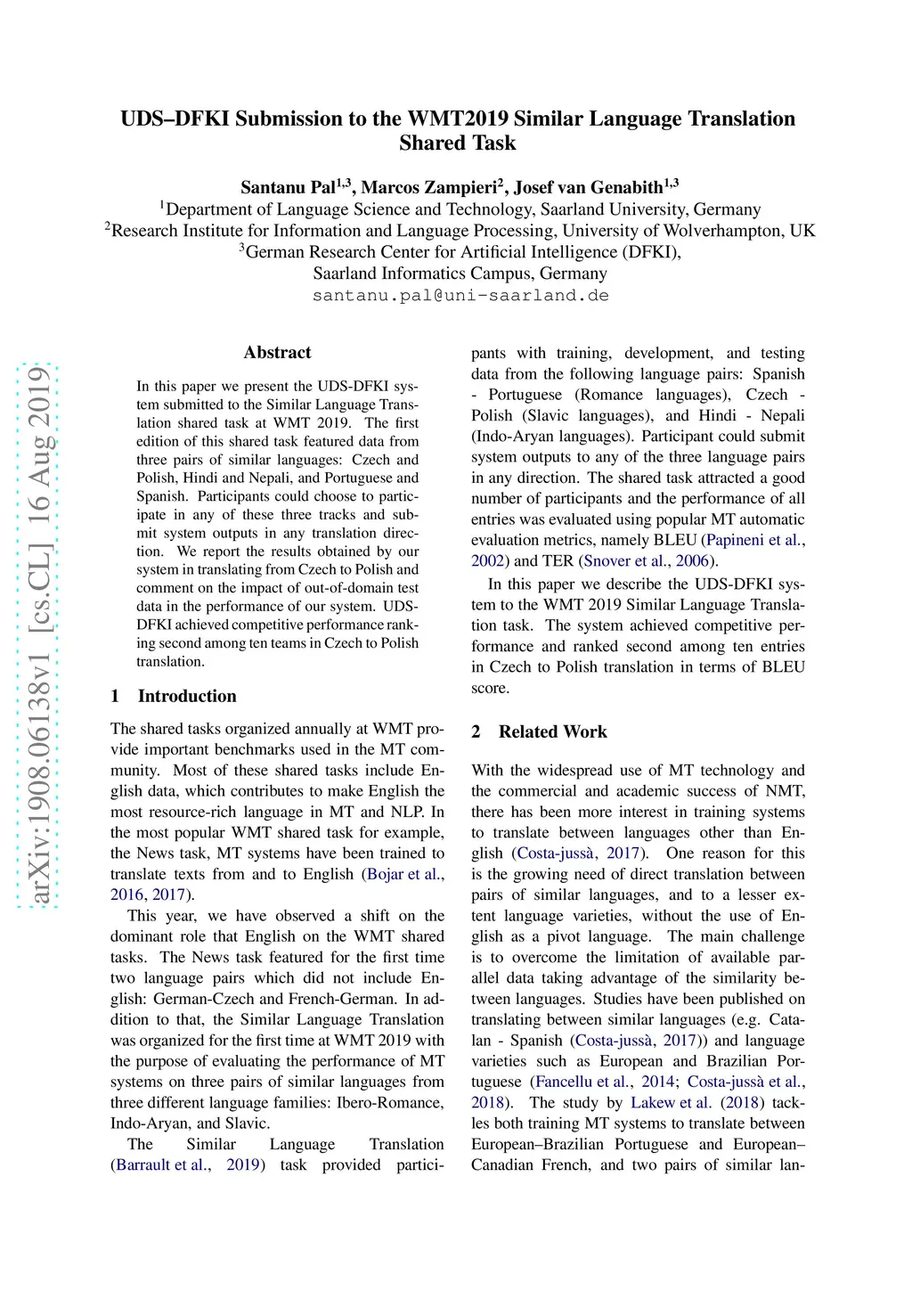 UDS--DFKI Submission to the WMT2019 Similar Language Translation Shared