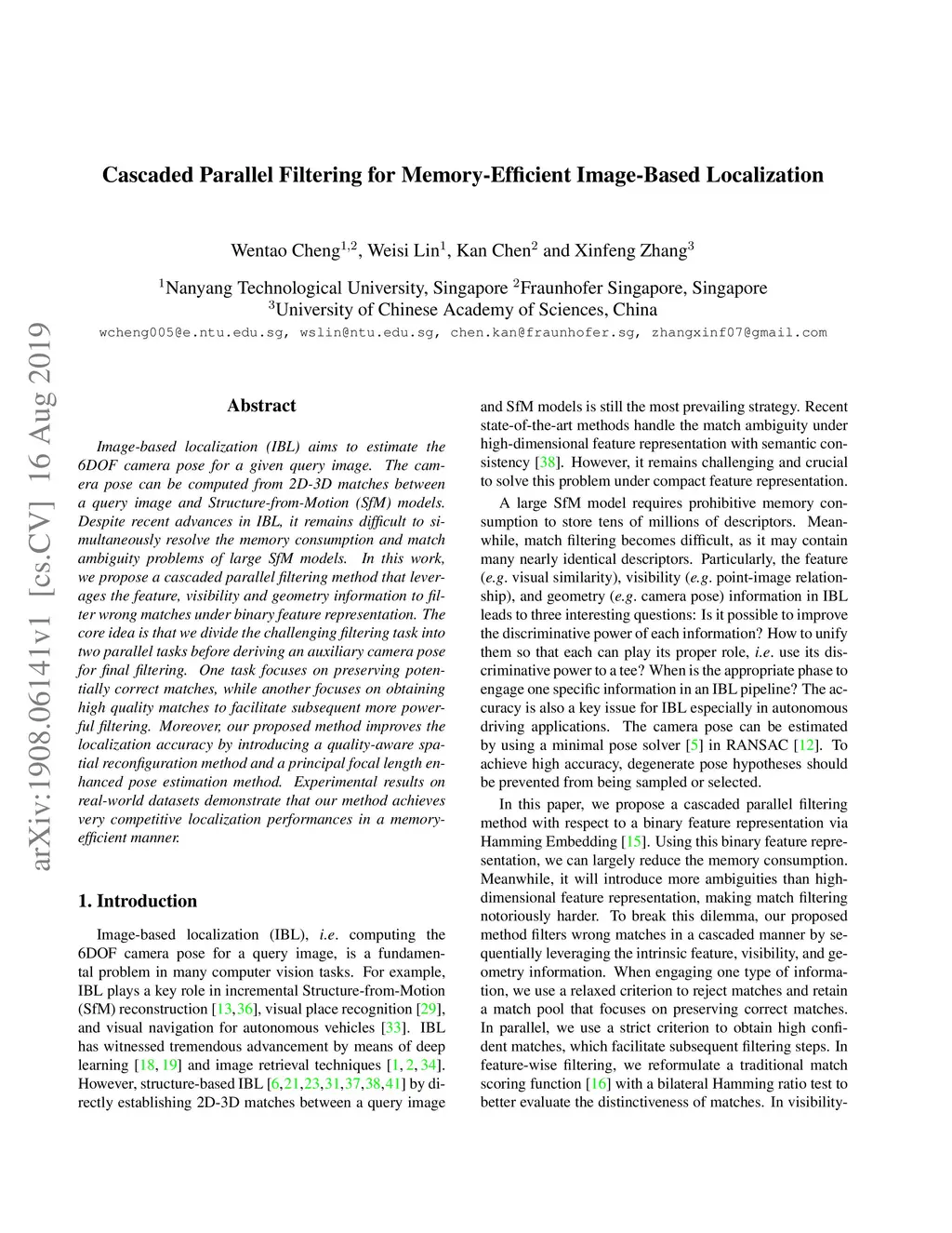 Image-based localization (IBL) aims to estimate the 6DOF camera pose for a given query image. The camera pose can be computed from 2D-3D matches between a query image and Structure-from-Motion (SfM) models. Despite recent advances in IBL, it remains difficult to simultaneously resolve the memory consumption and match ambiguity problems of large SfM models. In this work, we propose a cascaded parallel filtering method that leverages the feature, visibility and geometry information to filter wrong matches under binary feature representation. The core idea is that we divide the challenging filtering task into two parallel tasks before deriving an auxiliary camera pose for final filtering. One task focuses on preserving potentially correct matches, while another focuses on obtaining high quality matches to facilitate subsequent more powerful filtering. Moreover, our proposed method improves the localization accuracy by introducing a quality-aware spatial reconfiguration method and a principal focal length enhanced pose estimation method. Experimental results on real-world datasets demonstrate that our method achieves very competitive localization performances in a memory-efficient manner.