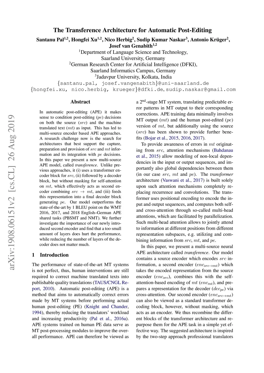 The Transference Architecture for Automatic Post-Editing