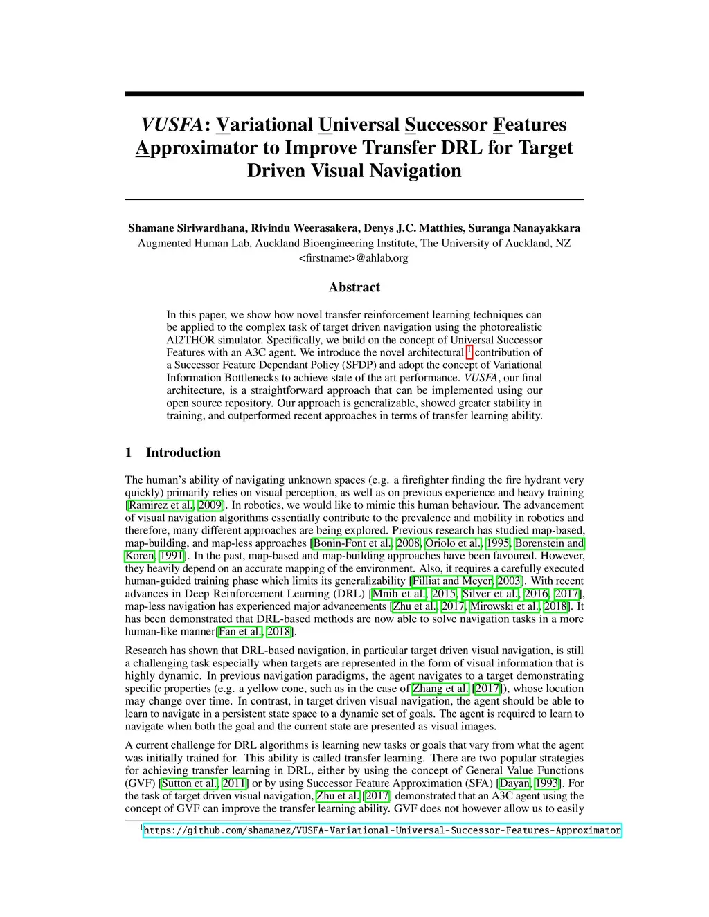 In this paper, we show how novel transfer reinforcement learning techniques can be applied to the complex task of target driven navigation using the photorealistic AI2THOR simulator. Specifically, we build on the concept of Universal Successor Features with an A3C agent. We introduce the novel architectural contribution of a Successor Feature Dependant Policy (SFDP) and adopt the concept of Variational Information Bottlenecks to achieve state of the art performance. VUSFA, our final architecture, is a straightforward approach that can be implemented using our open source repository. Our approach is generalizable, showed greater stability in training, and outperformed recent approaches in terms of transfer learning ability.