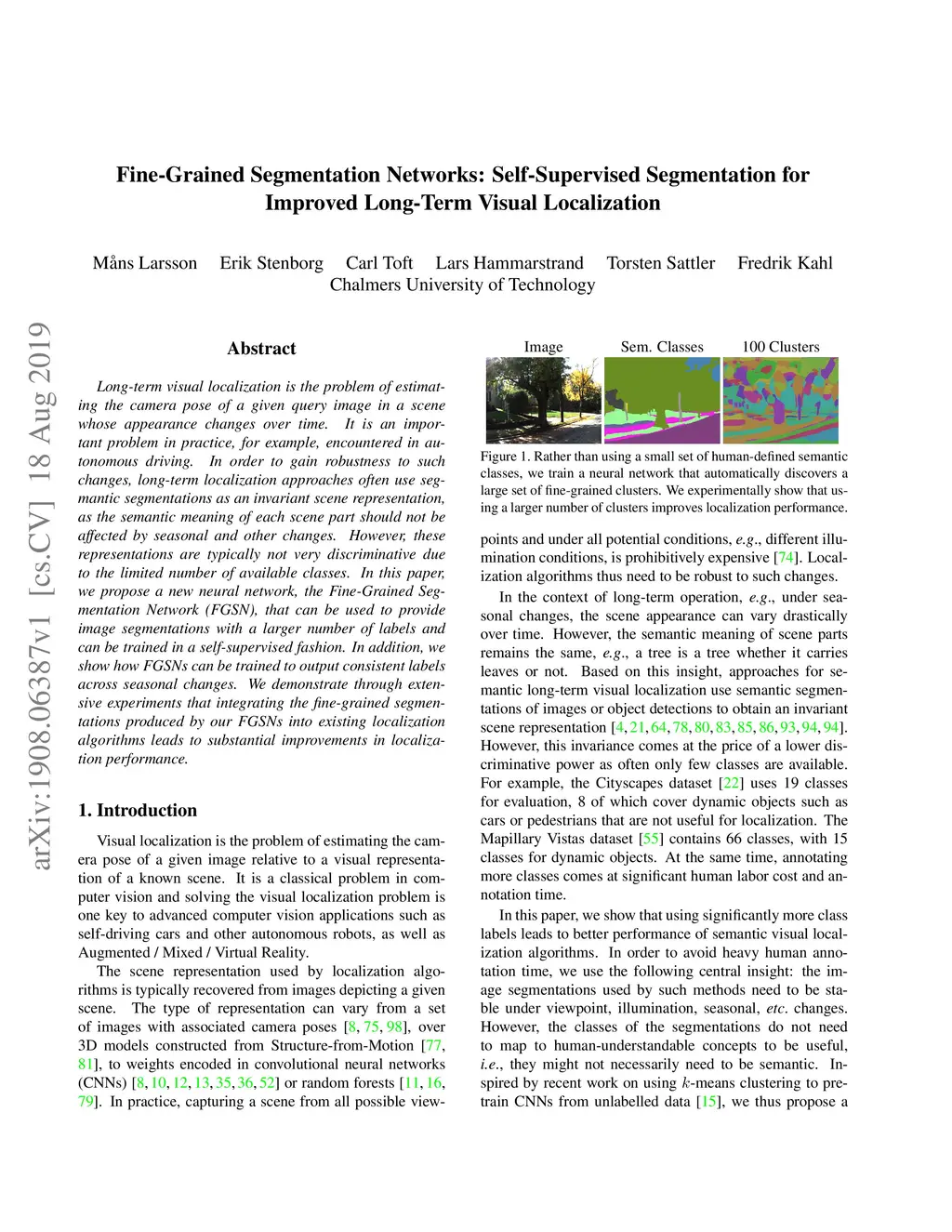 Long-term visual localization is the problem of estimating the camera pose of a given query image in a scene whose appearance changes over time. It is an important problem in practice, for example, encountered in autonomous driving. In order to gain robustness to such changes, long-term localization approaches often use segmantic segmentations as an invariant scene representation, as the semantic meaning of each scene part should not be affected by seasonal and other changes. However, these representations are typically not very discriminative due to the limited number of available classes. In this paper, we propose a new neural network, the Fine-Grained Segmentation Network (FGSN), that can be used to provide image segmentations with a larger number of labels and can be trained in a self-supervised fashion. In addition, we show how FGSNs can be trained to output consistent labels across seasonal changes. We demonstrate through extensive experiments that integrating the fine-grained segmentations produced by our FGSNs into existing localization algorithms leads to substantial improvements in localization performance.