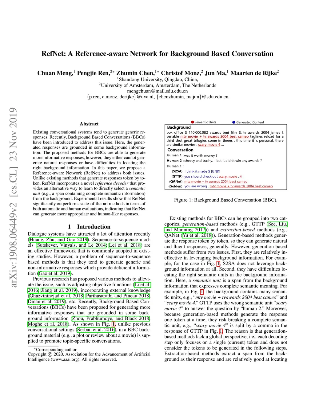 Existing conversational systems tend to generate generic responses. Recently, Background Based Conversations (BBCs) have been introduced to address this issue. Here, the generated responses are grounded in some background information. The proposed methods for BBCs are able to generate more informative responses, they either cannot generate natural responses or have difficulty in locating the right background information. In this paper, we propose a Reference-aware Network (RefNet) to address the two issues. Unlike existing methods that generate responses token by token, RefNet incorporates a novel reference decoder that provides an alternative way to learn to directly cite a semantic unit (e.g., a span containing complete semantic information) from the background. Experimental results show that RefNet significantly outperforms state-of-the-art methods in terms of both automatic and human evaluations, indicating that RefNet can generate more appropriate and human-like responses.