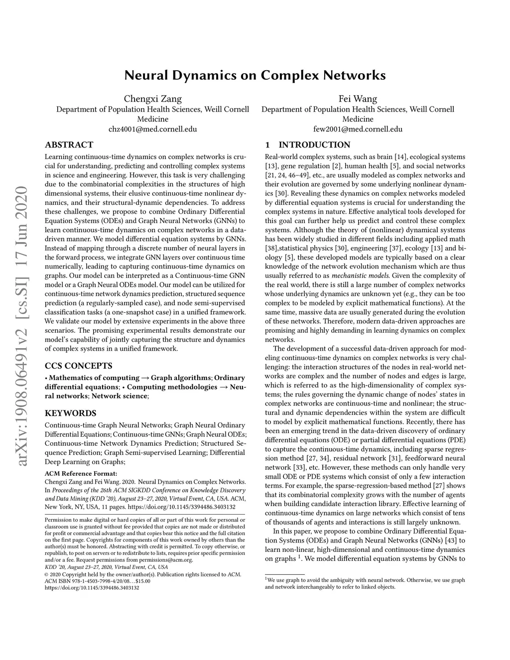 Learning continuous-time dynamics on complex networks is crucial for understanding, predicting and controlling complex systems in science and engineering. However, this task is very challenging due to the combinatorial complexities in the structures of high dimensional systems, their elusive continuous-time nonlinear dynamics, and their structural-dynamic dependencies. To address these challenges, we propose to combine Ordinary Differential Equation Systems (ODEs) and Graph Neural Networks (GNNs) to learn continuous-time dynamics on complex networks in a data-driven manner. We model differential equation systems by GNNs. Instead of mapping through a discrete number of neural layers in the forward process, we integrate GNN layers over continuous time numerically, leading to capturing continuous-time dynamics on graphs. Our model can be interpreted as a Continuous-time GNN model or a Graph Neural ODEs model. Our model can be utilized for continuous-time network dynamics prediction, structured sequence prediction (a regularly-sampled case), and node semi-supervised classification tasks (a one-snapshot case) in a unified framework. We validate our model by extensive experiments in the above three scenarios. The promising experimental results demonstrate our model's capability of jointly capturing the structure and dynamics of complex systems in a unified framework.