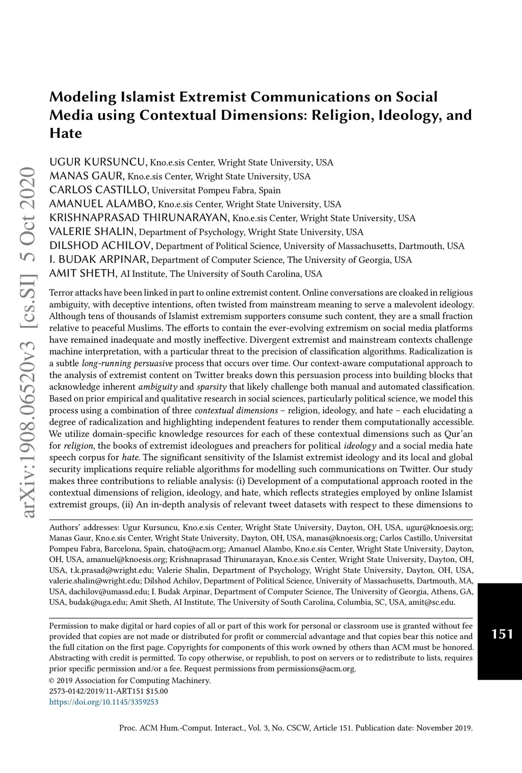 Terror attacks have been linked in part to online extremist content. Although tens of thousands of Islamist extremism supporters consume such content, they are a small fraction relative to peaceful Muslims. The efforts to contain the ever-evolving extremism on social media platforms have remained inadequate and mostly ineffective. Divergent extremist and mainstream contexts challenge machine interpretation, with a particular threat to the precision of classification algorithms. Our context-aware computational approach to the analysis of extremist content on Twitter breaks down this persuasion process into building blocks that acknowledge inherent ambiguity and sparsity that likely challenge both manual and automated classification. We model this process using a combination of three contextual dimensions -- religion, ideology, and hate -- each elucidating a degree of radicalization and highlighting independent features to render them computationally accessible. We utilize domain-specific knowledge resources for each of these contextual dimensions such as Qurán for religion, the books of extremist ideologues and preachers for political ideology and a social media hate speech corpus for hate. Our study makes three contributions to reliable analysis: (i) Development of a computational approach rooted in the contextual dimensions of religion, ideology, and hate that reflects strategies employed by online Islamist extremist groups, (ii) An in-depth analysis of relevant tweet datasets with respect to these dimensions to exclude likely mislabeled users, and (iii) A framework for understanding online radicalization as a process to assist counter-programming. Given the potentially significant social impact, we evaluate the performance of our algorithms to minimize mislabeling, where our approach outperforms a competitive baseline by 10.2% in precision.