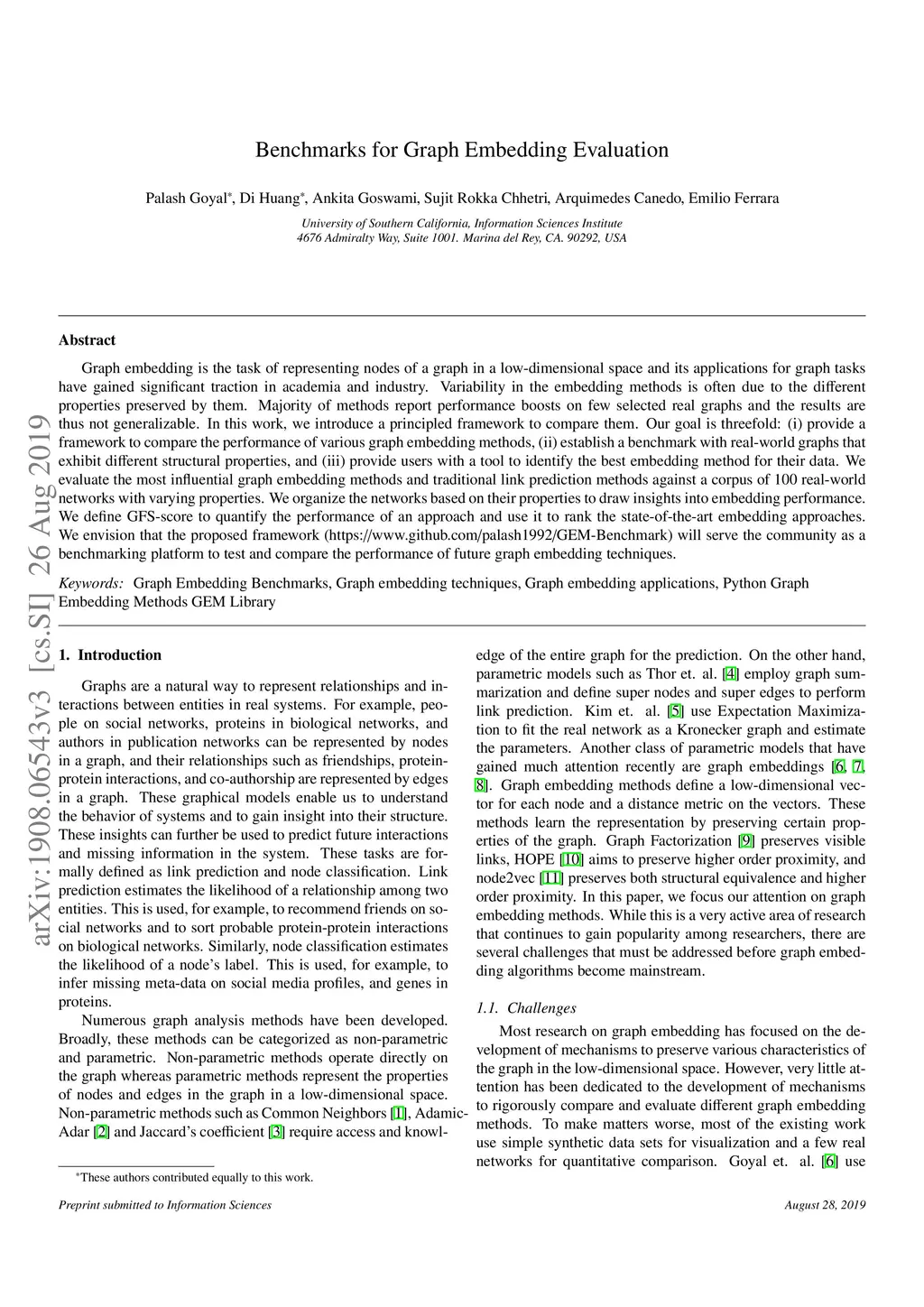 Graph embedding is the task of representing nodes of a graph in a low-dimensional space and its applications for graph tasks have gained significant traction in academia and industry. The primary difference among the many recently proposed graph embedding methods is the way they preserve the inherent properties of the graphs. However, in practice, comparing these methods is very challenging. The majority of methods report performance boosts on few selected real graphs. Therefore, it is difficult to generalize these performance improvements to other types of graphs. Given a graph, it is currently impossible to quantify the advantages of one approach over another. In this work, we introduce a principled framework to compare graph embedding methods. Our goal is threefold: (i) provide a unifying framework for comparing the performance of various graph embedding methods, (ii) establish a benchmark with real-world graphs that exhibit different structural properties, and (iii) provide users with a tool to identify the best graph embedding method for their data. This paper evaluates 4 of the most influential graph embedding methods and 4 traditional link prediction methods against a corpus of 100 real-world networks with varying properties. We organize the 100 networks in terms of their properties to get a better understanding of the embedding performance of these popular methods. We use the comparisons on our 100 benchmark graphs to define GFS-score, that can be applied to any embedding method to quantify its performance. We rank the state-of-the-art embedding approaches using the GFS-score and show that it can be used to understand and evaluate novel embedding approaches. We envision that the proposed framework (https://www.github.com/palash1992/GEM-Benchmark) will serve the community as a benchmarking platform to test and compare the performance of future graph embedding techniques.