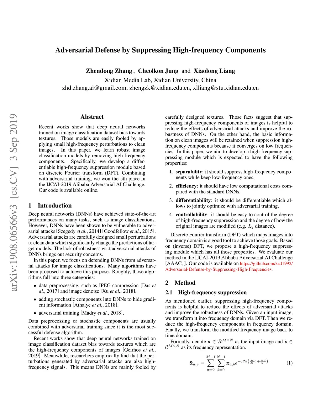Recent works show that deep neural networks trained on image classification dataset bias towards textures. Those models are easily fooled by applying small high-frequency perturbations to clean images. In this paper, we learn robust image classification models by removing high-frequency components. Specifically, we develop a differentiable high-frequency suppression module based on discrete Fourier transform (DFT). Combining with adversarial training, we won the 5th place in the IJCAI-2019 Alibaba Adversarial AI Challenge. Our code is available online.