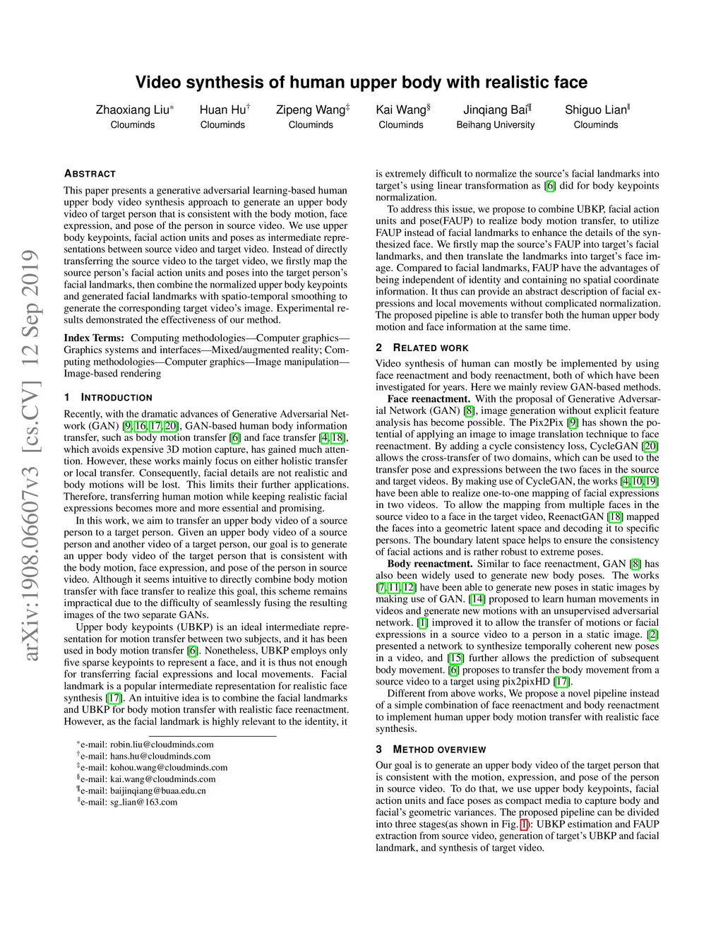 Video synthesis of human upper body with realistic face
