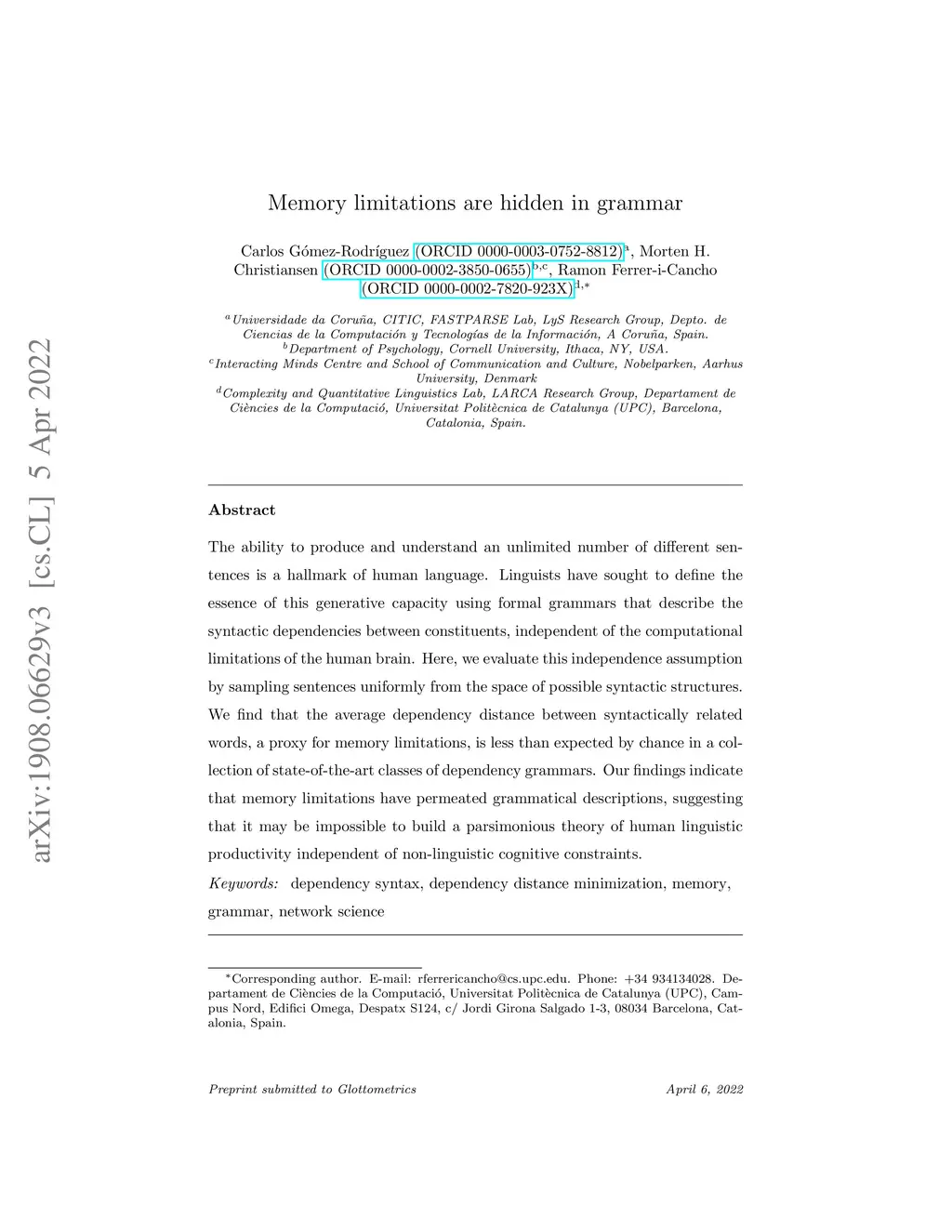 The ability to produce and understand an unlimited number of different sentences is a hallmark of human language. Linguists have sought to define the essence of this generative capacity using formal grammars that describe the syntactic dependencies between constituents, independent of the computational limitations of the human brain. Here, we evaluate this independence assumption by sampling sentences uniformly from the space of possible syntactic structures. We find that the average dependency distance between syntactically related words, a proxy for memory limitations, is less than expected by chance in a collection of state-of-the-art classes of dependency grammars. Our findings indicate that memory limitations have permeated grammatical descriptions, suggesting that it may be impossible to build a parsimonious theory of human linguistic productivity independent of non-linguistic cognitive constraints.