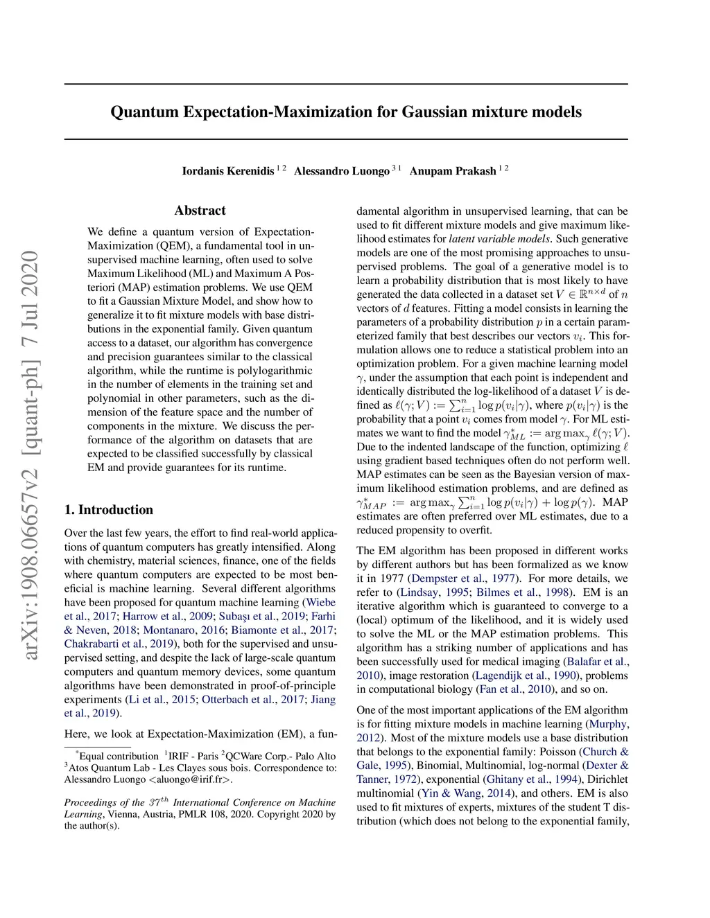 The Expectation-Maximization (EM) algorithm is a fundamental tool in unsupervised machine learning. It is often used as an efficient way to solve Maximum Likelihood (ML) estimation problems, especially for models with latent variables. It is also the algorithm of choice to fit mixture models: generative models that represent unlabelled points originating from different processes, as samples from multivariate distributions. In this work we define and use a quantum version of EM to fit a Gaussian Mixture Model. Given quantum access to a dataset of vectors of dimension , our algorithm has convergence and precision guarantees similar to the classical algorithm, but the runtime is only polylogarithmic in the number of elements in the training set, and is polynomial in other parameters - as the dimension of the feature space, and the number of components in the mixture. We generalize further the algorithm in two directions. First, we show how to fit any mixture model of probability distributions in the exponential family. Then, we show how to use this algorithm to compute the Maximum a Posteriori (MAP) estimate of a mixture model: the Bayesian approach to likelihood estimation problems. We discuss the performance of the algorithm on a dataset that is expected to be classified successfully by this algorithm, arguing that on those cases we can give strong guarantees on the runtime.