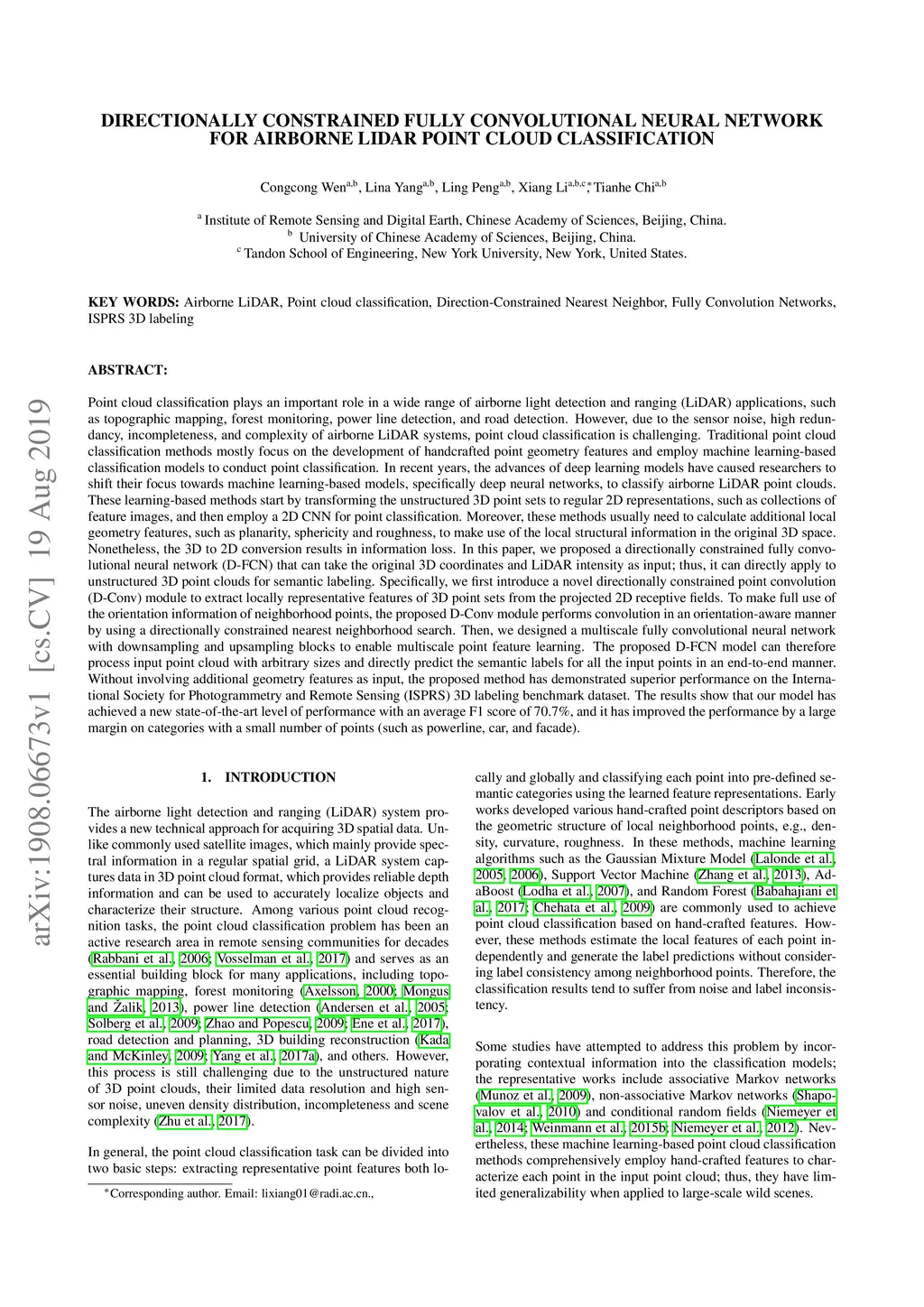 Point cloud classification plays an important role in a wide range of airborne light detection and ranging (LiDAR) applications, such as topographic mapping, forest monitoring, power line detection, and road detection. However, due to the sensor noise, high redundancy, incompleteness, and complexity of airborne LiDAR systems, point cloud classification is challenging. In this paper, we proposed a directionally constrained fully convolutional neural network (D-FCN) that can take the original 3D coordinates and LiDAR intensity as input; thus, it can directly apply to unstructured 3D point clouds for semantic labeling. Specifically, we first introduce a novel directionally constrained point convolution (D-Conv) module to extract locally representative features of 3D point sets from the projected 2D receptive fields. To make full use of the orientation information of neighborhood points, the proposed D-Conv module performs convolution in an orientation-aware manner by using a directionally constrained nearest neighborhood search. Then, we designed a multiscale fully convolutional neural network with downsampling and upsampling blocks to enable multiscale point feature learning. The proposed D-FCN model can therefore process input point cloud with arbitrary sizes and directly predict the semantic labels for all the input points in an end-to-end manner. Without involving additional geometry features as input, the proposed method has demonstrated superior performance on the International Society for Photogrammetry and Remote Sensing (ISPRS) 3D labeling benchmark dataset. The results show that our model has achieved a new state-of-the-art level of performance with an average F1 score of 70.7%, and it has improved the performance by a large margin on categories with a small number of points (such as powerline, car, and facade).