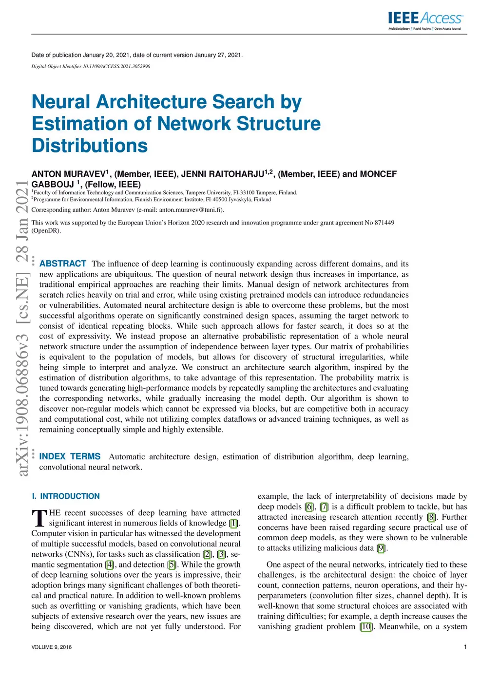 The influence of deep learning is continuously expanding across different domains, and its new applications are ubiquitous. The question of neural network design thus increases in importance, as traditional empirical approaches are reaching their limits. Manual design of network architectures from scratch relies heavily on trial and error, while using existing pretrained models can introduce redundancies or vulnerabilities. Automated neural architecture design is able to overcome these problems, but the most successful algorithms operate on significantly constrained design spaces, assuming the target network to consist of identical repeating blocks. While such approach allows for faster search, it does so at the cost of expressivity. We instead propose an alternative probabilistic representation of a whole neural network structure under the assumption of independence between layer types. Our matrix of probabilities is equivalent to the population of models, but allows for discovery of structural irregularities, while being simple to interpret and analyze. We construct an architecture search algorithm, inspired by the estimation of distribution algorithms, to take advantage of this representation. The probability matrix is tuned towards generating high-performance models by repeatedly sampling the architectures and evaluating the corresponding networks, while gradually increasing the model depth. Our algorithm is shown to discover non-regular models which cannot be expressed via blocks, but are competitive both in accuracy and computational cost, while not utilizing complex dataflows or advanced training techniques, as well as remaining conceptually simple and highly extensible.