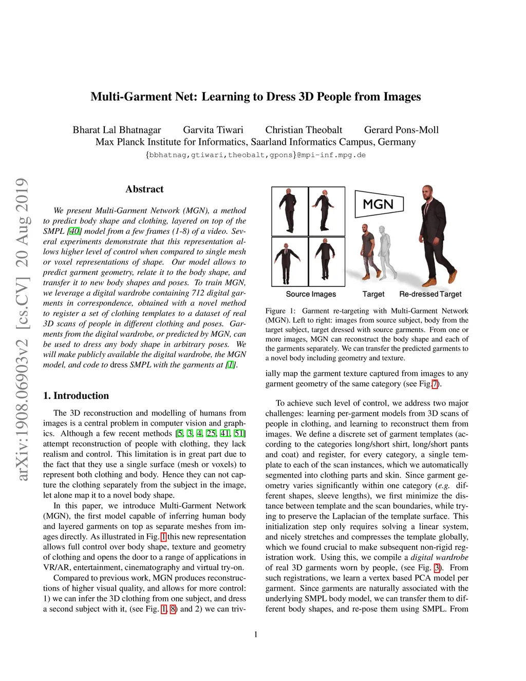 We present Multi-Garment Network (MGN), a method to predict body shape and clothing, layered on top of the SMPL model from a few frames (1-8) of a video. Several experiments demonstrate that this representation allows higher level of control when compared to single mesh or voxel representations of shape. Our model allows to predict garment geometry, relate it to the body shape, and transfer it to new body shapes and poses. To train MGN, we leverage a digital wardrobe containing 712 digital garments in correspondence, obtained with a novel method to register a set of clothing templates to a dataset of real 3D scans of people in different clothing and poses. Garments from the digital wardrobe, or predicted by MGN, can be used to dress any body shape in arbitrary poses. We will make publicly available the digital wardrobe, the MGN model, and code to dress SMPL with the garments.