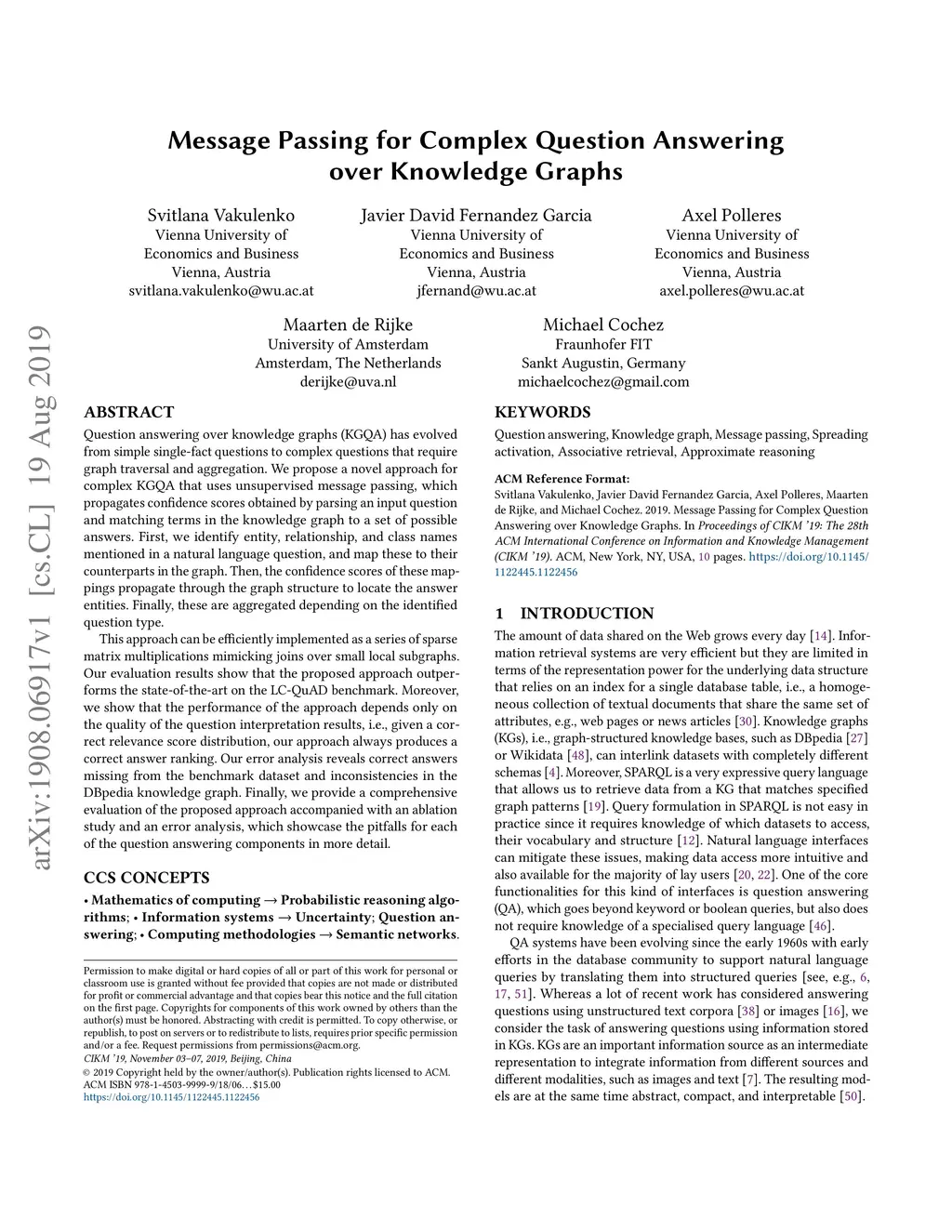 Question answering over knowledge graphs (KGQA) has evolved from simple single-fact questions to complex questions that require graph traversal and aggregation. We propose a novel approach for complex KGQA that uses unsupervised message passing, which propagates confidence scores obtained by parsing an input question and matching terms in the knowledge graph to a set of possible answers. First, we identify entity, relationship, and class names mentioned in a natural language question, and map these to their counterparts in the graph. Then, the confidence scores of these mappings propagate through the graph structure to locate the answer entities. Finally, these are aggregated depending on the identified question type. This approach can be efficiently implemented as a series of sparse matrix multiplications mimicking joins over small local subgraphs. Our evaluation results show that the proposed approach outperforms the state-of-the-art on the LC-QuAD benchmark. Moreover, we show that the performance of the approach depends only on the quality of the question interpretation results, i.e., given a correct relevance score distribution, our approach always produces a correct answer ranking. Our error analysis reveals correct answers missing from the benchmark dataset and inconsistencies in the DBpedia knowledge graph. Finally, we provide a comprehensive evaluation of the proposed approach accompanied with an ablation study and an error analysis, which showcase the pitfalls for each of the question answering components in more detail.