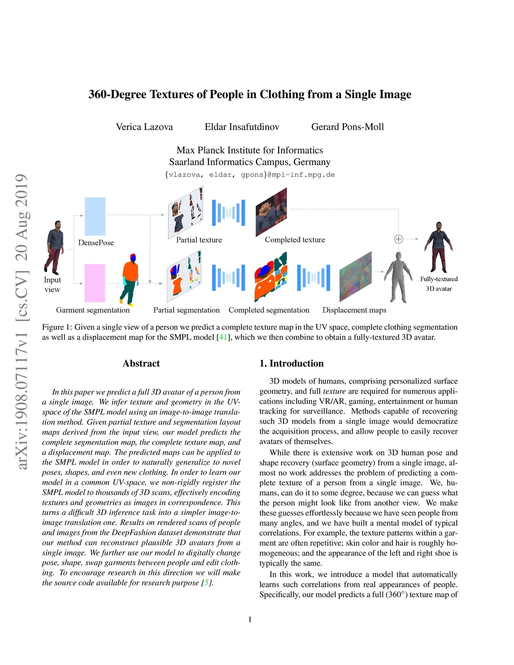 In this paper we predict a full 3D avatar of a person from a single image. We infer texture and geometry in the UV-space of the SMPL model using an image-to-image translation method. Given partial texture and segmentation layout maps derived from the input view, our model predicts the complete segmentation map, the complete texture map, and a displacement map. The predicted maps can be applied to the SMPL model in order to naturally generalize to novel poses, shapes, and even new clothing. In order to learn our model in a common UV-space, we non-rigidly register the SMPL model to thousands of 3D scans, effectively encoding textures and geometries as images in correspondence. This turns a difficult 3D inference task into a simpler image-to-image translation one. Results on rendered scans of people and images from the DeepFashion dataset demonstrate that our method can reconstruct plausible 3D avatars from a single image. We further use our model to digitally change pose, shape, swap garments between people and edit clothing. To encourage research in this direction we will make the source code available for research purpose.