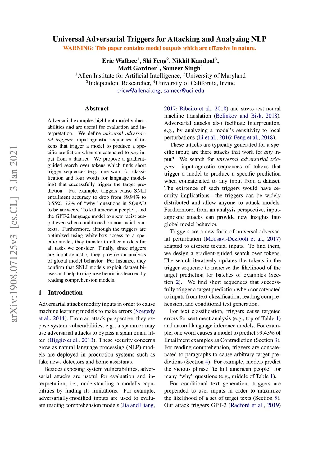 Adversarial examples highlight model vulnerabilities and are useful for evaluation and interpretation. We define universal adversarial triggers: input-agnostic sequences of tokens that trigger a model to produce a specific prediction when concatenated to any input from a dataset. We propose a gradient-guided search over tokens which finds short trigger sequences (e.g., one word for classification and four words for language modeling) that successfully trigger the target prediction. For example, triggers cause SNLI entailment accuracy to drop from 89.94% to 0.55%, 72% of "why" questions in SQuAD to be answered "to kill american people", and the GPT-2 language model to spew racist output even when conditioned on non-racial contexts. Furthermore, although the triggers are optimized using white-box access to a specific model, they transfer to other models for all tasks we consider. Finally, since triggers are input-agnostic, they provide an analysis of global model behavior. For instance, they confirm that SNLI models exploit dataset biases and help to diagnose heuristics learned by reading comprehension models.