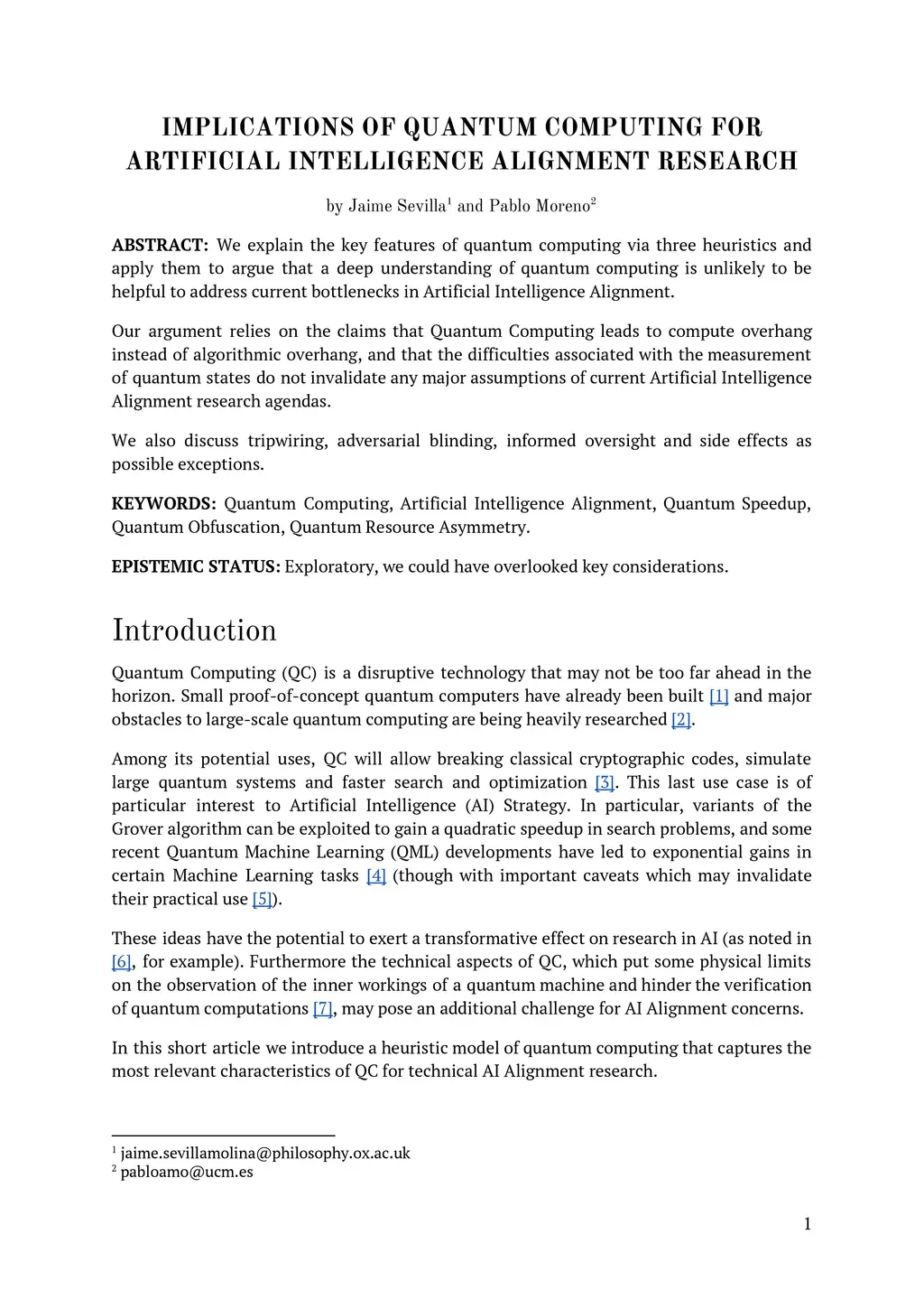 We explain some key features of quantum computing via three heuristics and apply them to argue that a deep understanding of quantum computing is unlikely to be helpful to address current bottlenecks in Artificial Intelligence Alignment. Our argument relies on the claims that Quantum Computing leads to compute overhang instead of algorithmic overhang, and that the difficulties associated with the measurement of quantum states do not invalidate any major assumptions of current Artificial Intelligence Alignment research agendas. We also discuss tripwiring, adversarial blinding, informed oversight and side effects as possible exceptions.