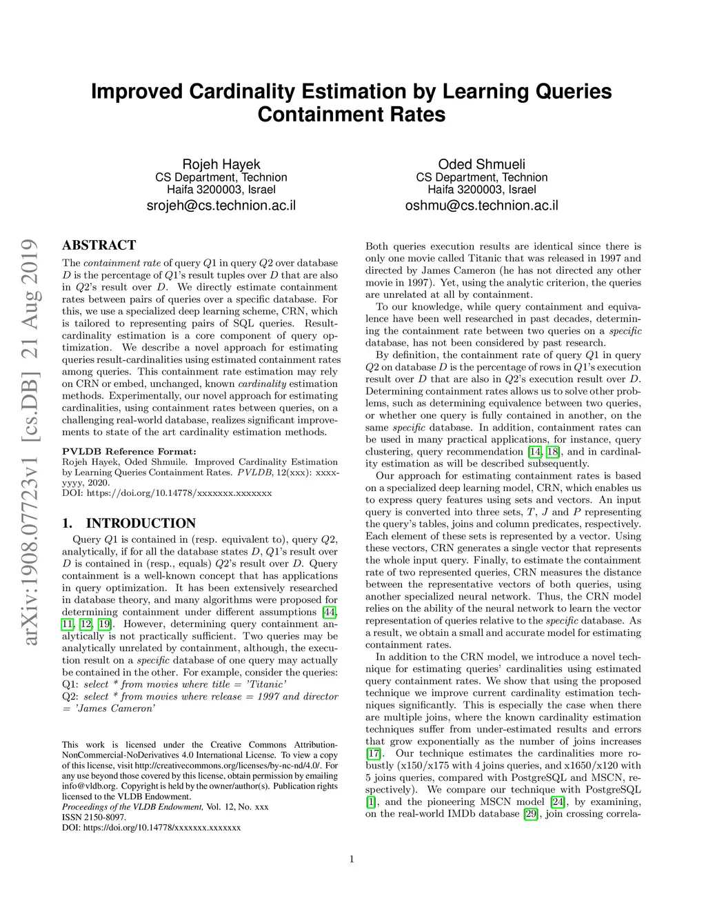 The containment rate of query Q1 in query Q2 over database D is the percentage of Q1's result tuples over D that are also in Q2's result over D. We directly estimate containment rates between pairs of queries over a specific database. For this, we use a specialized deep learning scheme, CRN, which is tailored to representing pairs of SQL queries. Result-cardinality estimation is a core component of query optimization. We describe a novel approach for estimating queries result-cardinalities using estimated containment rates among queries. This containment rate estimation may rely on CRN or embed, unchanged, known cardinality estimation methods. Experimentally, our novel approach for estimating cardinalities, using containment rates between queries, on a challenging real-world database, realizes significant improvements to state of the art cardinality estimation methods.