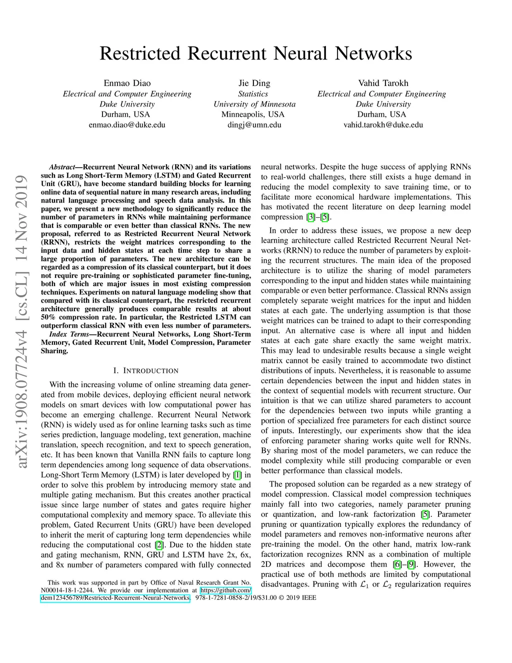 Recurrent Neural Network (RNN) and its variations such as Long Short-Term Memory (LSTM) and Gated Recurrent Unit (GRU), have become standard building blocks for learning online data of sequential nature in many research areas, including natural language processing and speech data analysis. In this paper, we present a new methodology to significantly reduce the number of parameters in RNNs while maintaining performance that is comparable or even better than classical RNNs. The new proposal, referred to as Restricted Recurrent Neural Network (RRNN), restricts the weight matrices corresponding to the input data and hidden states at each time step to share a large proportion of parameters. The new architecture can be regarded as a compression of its classical counterpart, but it does not require pre-training or sophisticated parameter fine-tuning, both of which are major issues in most existing compression techniques. Experiments on natural language modeling show that compared with its classical counterpart, the restricted recurrent architecture generally produces comparable results at about 50\% compression rate. In particular, the Restricted LSTM can outperform classical RNN with even less number of parameters.