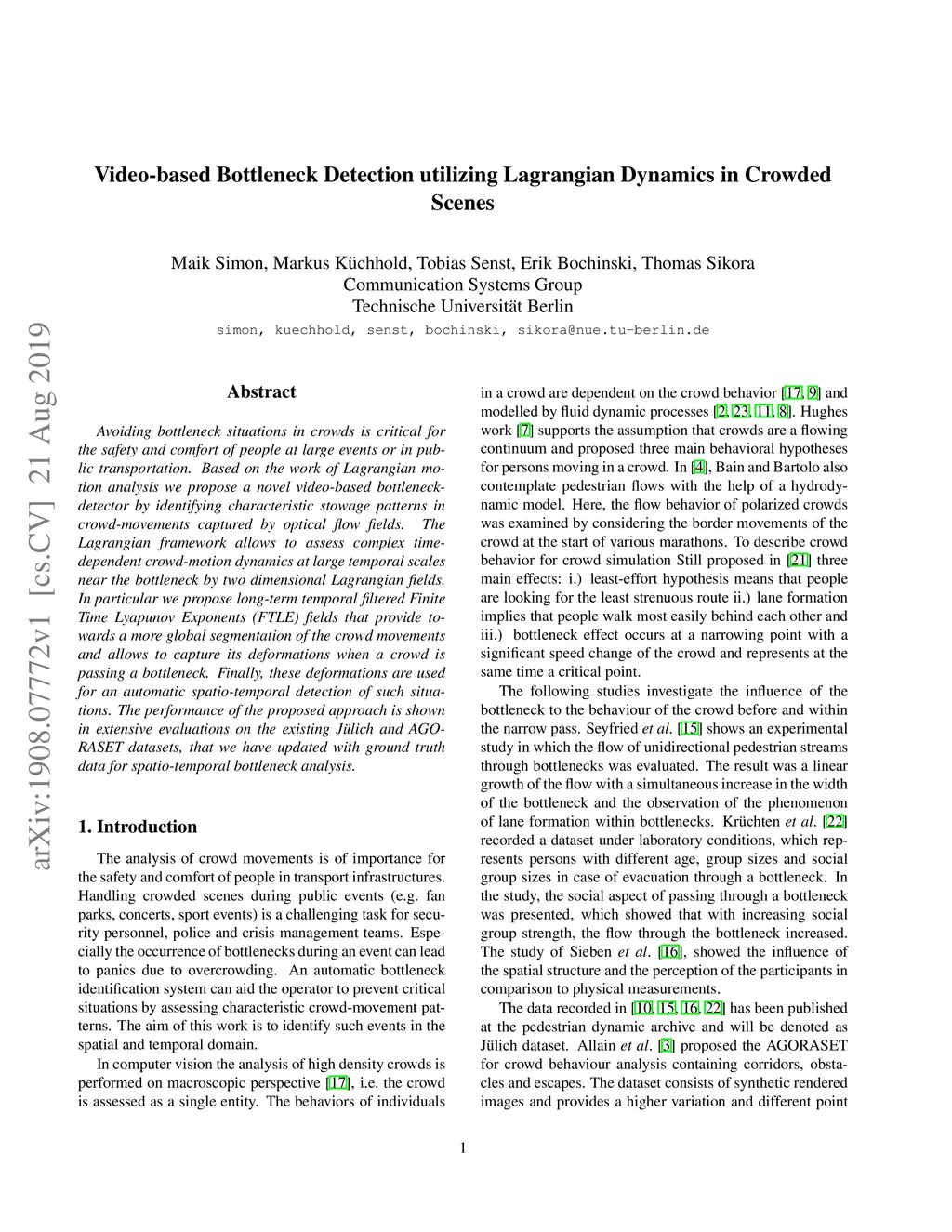 Video-based Bottleneck Detection utilizing Lagrangian Dynamics in