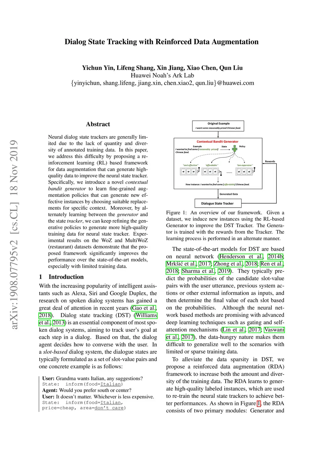 Neural dialog state trackers are generally limited due to the lack of quantity and diversity of annotated training data. In this paper, we address this difficulty by proposing a reinforcement learning (RL) based framework for data augmentation that can generate high-quality data to improve the neural state tracker. Specifically, we introduce a novel contextual bandit generator to learn fine-grained augmentation policies that can generate new effective instances by choosing suitable replacements for the specific context. Moreover, by alternately learning between the generator and the state tracker, we can keep refining the generative policies to generate more high-quality training data for neural state tracker. Experimental results on the WoZ and MultiWoZ (restaurant) datasets demonstrate that the proposed framework significantly improves the performance over the state-of-the-art models, especially with limited training data.