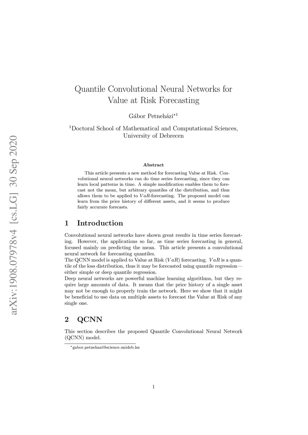 This article presents a new method for forecasting Value at Risk. Convolutional neural networks can do time series forecasting, since they can learn local patterns in time. A simple modification enables them to forecast not the mean, but arbitrary quantiles of the distribution, and thus allows them to be applied to VaR-forecasting. The proposed model can learn from the price history of different assets, and it seems to produce fairly accurate forecasts.