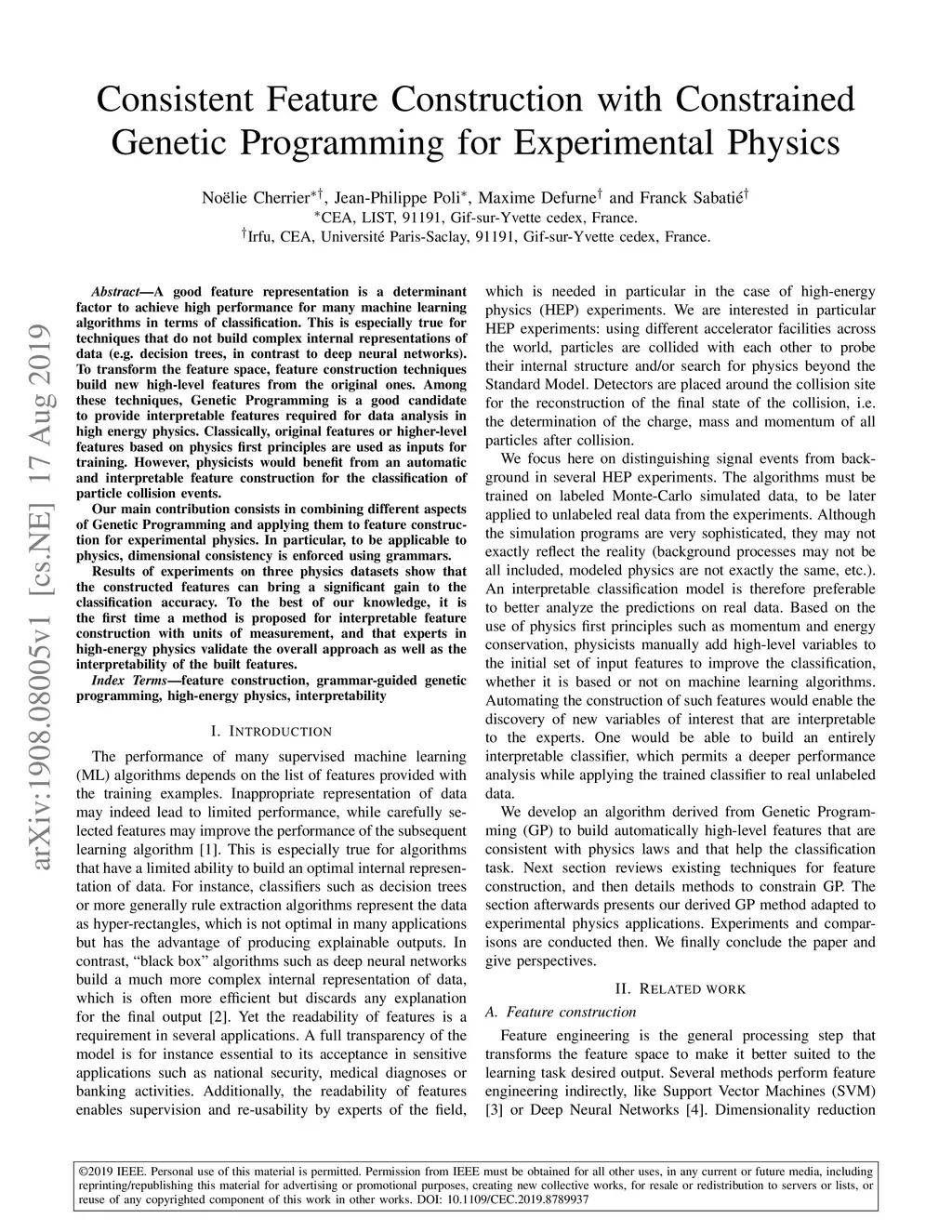 A good feature representation is a determinant factor to achieve high performance for many machine learning algorithms in terms of classification. This is especially true for techniques that do not build complex internal representations of data (e.g. decision trees, in contrast to deep neural networks). To transform the feature space, feature construction techniques build new high-level features from the original ones. Among these techniques, Genetic Programming is a good candidate to provide interpretable features required for data analysis in high energy physics. Classically, original features or higher-level features based on physics first principles are used as inputs for training. However, physicists would benefit from an automatic and interpretable feature construction for the classification of particle collision events. Our main contribution consists in combining different aspects of Genetic Programming and applying them to feature construction for experimental physics. In particular, to be applicable to physics, dimensional consistency is enforced using grammars. Results of experiments on three physics datasets show that the constructed features can bring a significant gain to the classification accuracy. To the best of our knowledge, it is the first time a method is proposed for interpretable feature construction with units of measurement, and that experts in high-energy physics validate the overall approach as well as the interpretability of the built features.