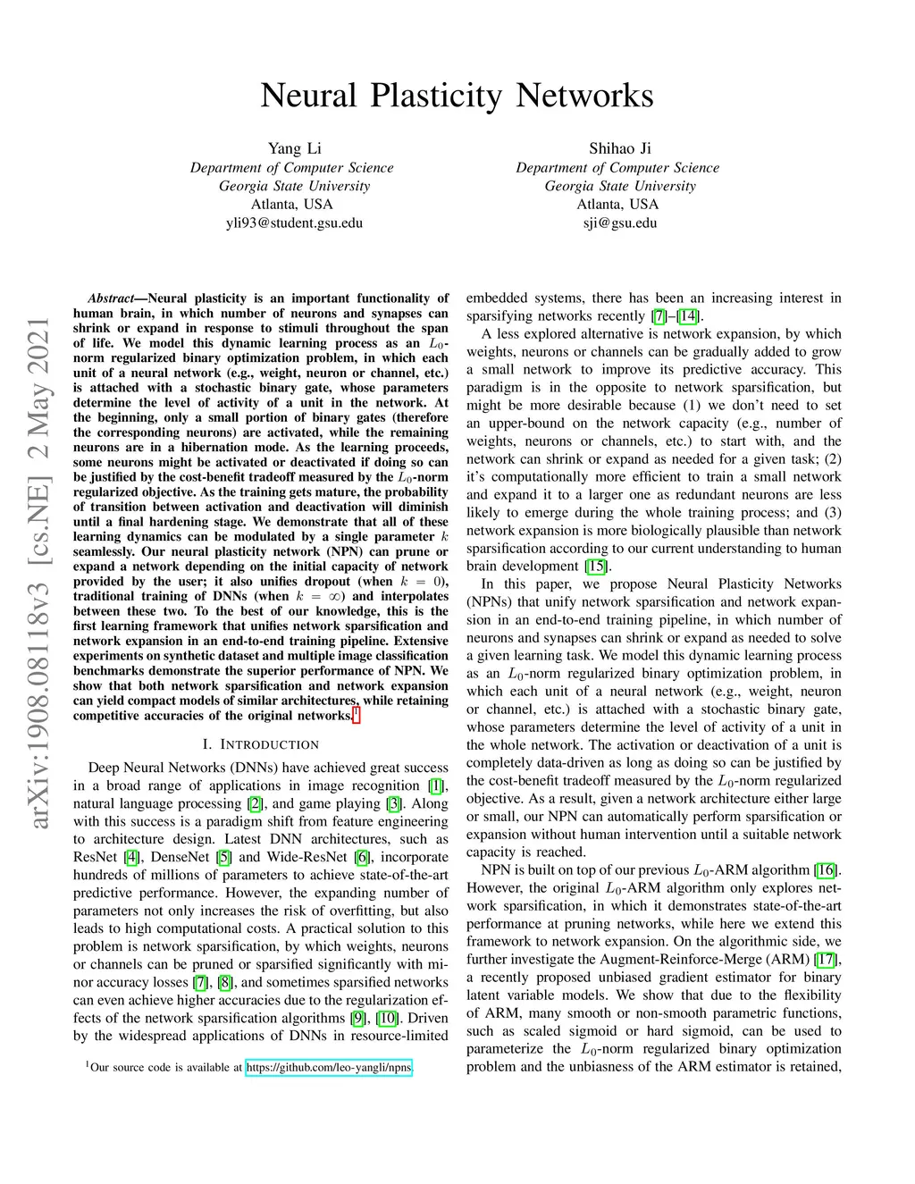 Neural plasticity is an important functionality of human brain, in which number of neurons and synapses can shrink or expand in response to stimuli throughout the span of life. We model this dynamic learning process as an -norm regularized binary optimization problem, in which each unit of a neural network (e.g., weight, neuron or channel, etc.) is attached with a stochastic binary gate, whose parameters determine the level of activity of a unit in the network. At the beginning, only a small portion of binary gates (therefore the corresponding neurons) are activated, while the remaining neurons are in a hibernation mode. As the learning proceeds, some neurons might be activated or deactivated if doing so can be justified by the cost-benefit tradeoff measured by the -norm regularized objective. As the training gets mature, the probability of transition between activation and deactivation will diminish until a final hardening stage. We demonstrate that all of these learning dynamics can be modulated by a single parameter seamlessly. Our neural plasticity network (NPN) can prune or expand a network depending on the initial capacity of network provided by the user; it also unifies dropout (when ), traditional training of DNNs (when ) and interpolates between these two. To the best of our knowledge, this is the first learning framework that unifies network sparsification and network expansion in an end-to-end training pipeline. Extensive experiments on synthetic dataset and multiple image classification benchmarks demonstrate the superior performance of NPN. We show that both network sparsification and network expansion can yield compact models of similar architectures and of similar predictive accuracies that are close to or sometimes even higher than baseline networks. We plan to release our code to facilitate the research in this area.