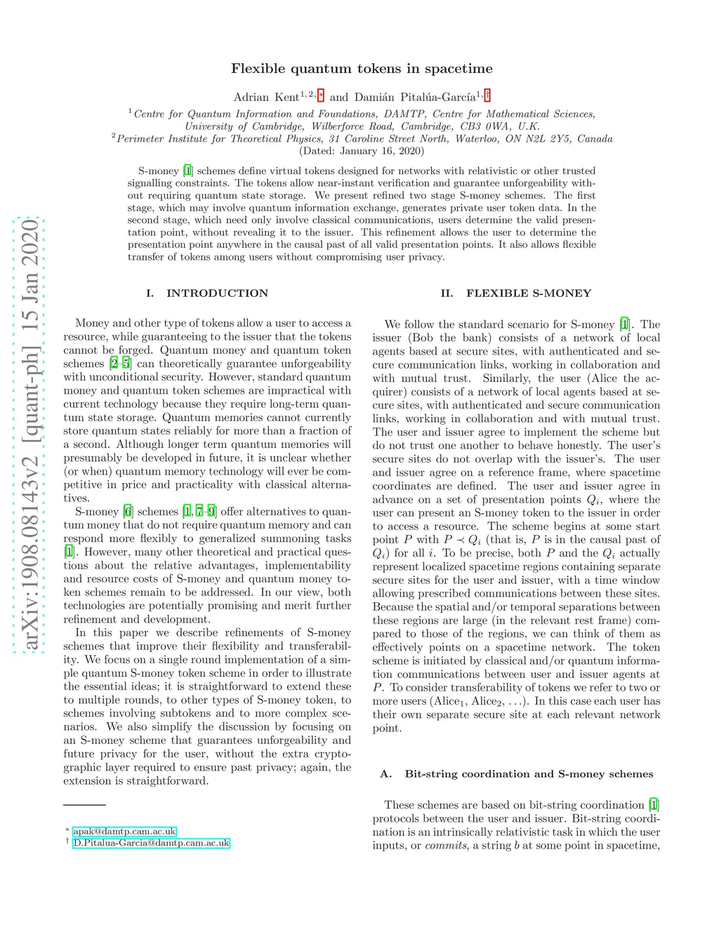 S-money [Proc. R. Soc. A 475, 20190170 (2019)] schemes define virtual tokens designed for networks with relativistic or other trusted signalling constraints. The tokens allow near-instant verification and guarantee unforgeability without requiring quantum state storage. We present refined two stage S-money schemes. The first stage, which may involve quantum information exchange, generates private user token data. In the second stage, which need only involve classical communications, users determine the valid presentation point, without revealing it to the issuer. This refinement allows the user to determine the presentation point anywhere in the causal past of all valid presentation points. It also allows flexible transfer of tokens among users without compromising user privacy.