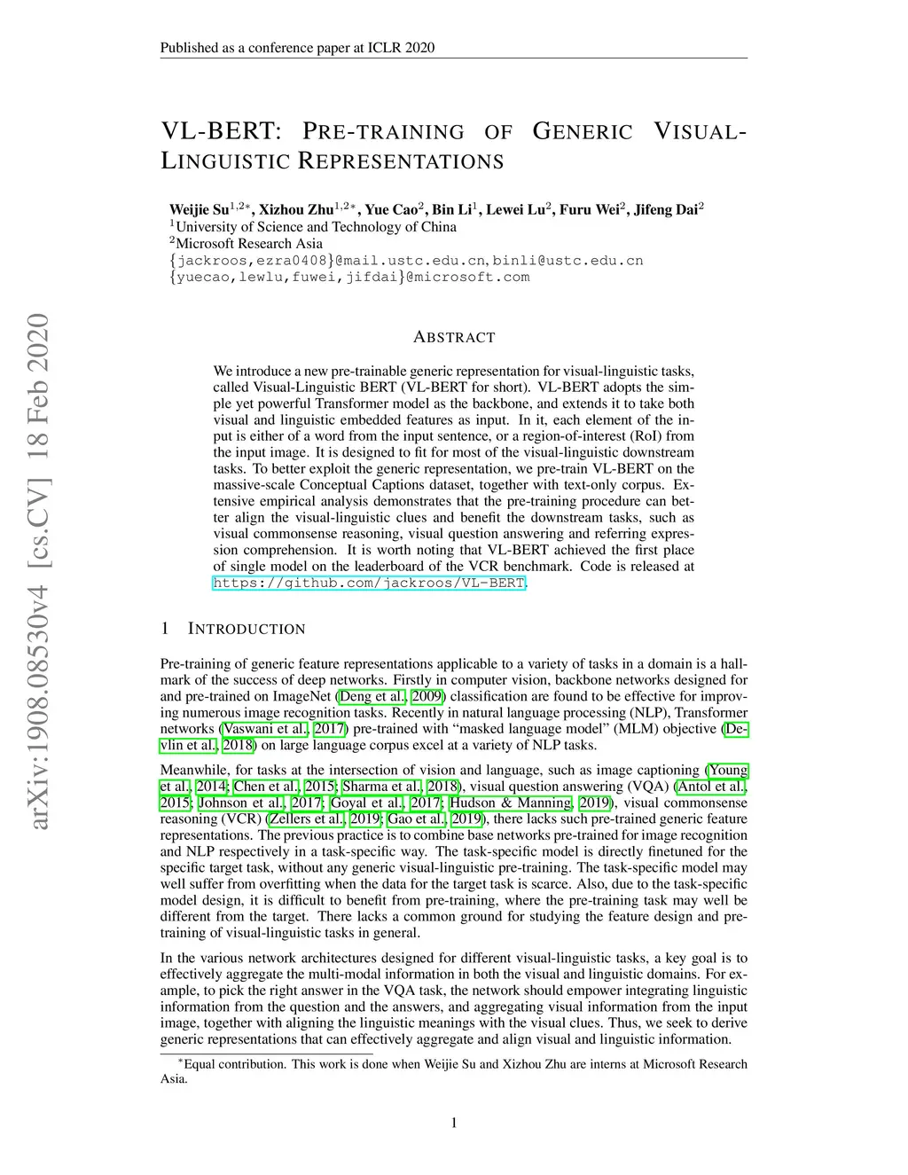 We introduce a new pre-trainable generic representation for visual-linguistic tasks, called Visual-Linguistic BERT (VL-BERT for short). VL-BERT adopts the simple yet powerful Transformer model as the backbone, and extends it to take both visual and linguistic embedded features as input. In it, each element of the input is either of a word from the input sentence, or a region-of-interest (RoI) from the input image. It is designed to fit for most of the visual-linguistic downstream tasks. To better exploit the generic representation, we pre-train VL-BERT on the massive-scale Conceptual Captions dataset, together with text-only corpus. Extensive empirical analysis demonstrates that the pre-training procedure can better align the visual-linguistic clues and benefit the downstream tasks, such as visual commonsense reasoning, visual question answering and referring expression comprehension. It is worth noting that VL-BERT achieved the first place of single model on the leaderboard of the VCR benchmark. Code is released at \url{https://github.com/jackroos/VL-BERT}.