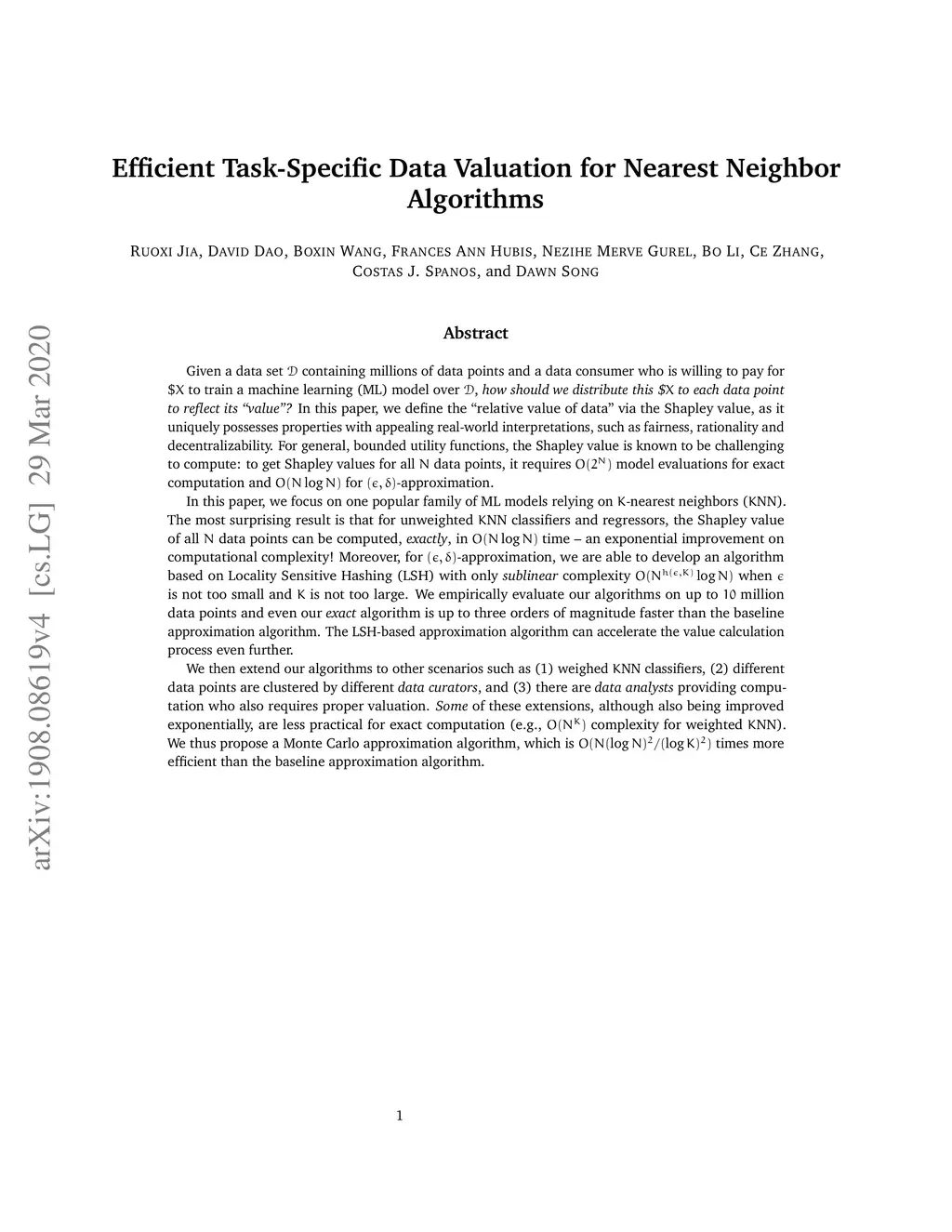 Given a data set containing millions of data points and a data consumer who is willing to pay for \$ to train a machine learning (ML) model over , how should we distribute this \$ to each data point to reflect its "value"? In this paper, we define the "relative value of data" via the Shapley value, as it uniquely possesses properties with appealing real-world interpretations, such as fairness, rationality and decentralizability. For general, bounded utility functions, the Shapley value is known to be challenging to compute: to get Shapley values for all data points, it requires model evaluations for exact computation and for -approximation. In this paper, we focus on one popular family of ML models relying on -nearest neighbors (NN). The most surprising result is that for unweighted NN classifiers and regressors, the Shapley value of all data points can be computed, exactly, in time -- an exponential improvement on computational complexity! Moreover, for -approximation, we are able to develop an algorithm based on Locality Sensitive Hashing (LSH) with only sublinear complexity when is not too small and is not too large. We empirically evaluate our algorithms on up to million data points and even our exact algorithm is up to three orders of magnitude faster than the baseline approximation algorithm. The LSH-based approximation algorithm can accelerate the value calculation process even further. We then extend our algorithms to other scenarios such as (1) weighed NN classifiers, (2) different data points are clustered by different data curators, and (3) there are data analysts providing computation who also requires proper valuation.