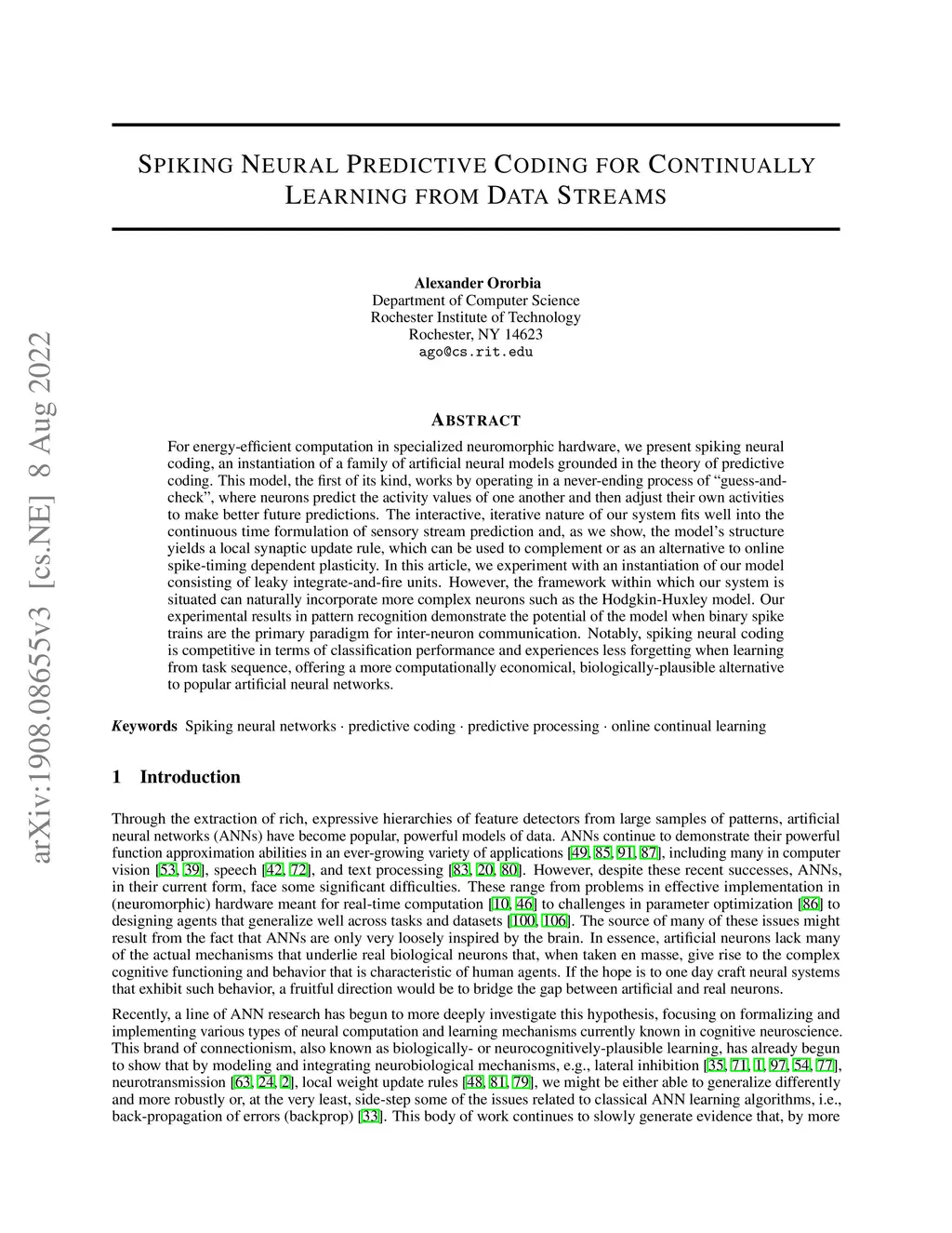 For energy-efficient computation in specialized neuromorphic hardware, we present spiking neural coding, an instantiation of a family of artificial neural models grounded in the theory of predictive coding. This model, the first of its kind, works by operating in a never-ending process of "guess-and-check", where neurons predict the activity values of one another and then adjust their own activities to make better future predictions. The interactive, iterative nature of our system fits well into the continuous time formulation of sensory stream prediction and, as we show, the model's structure yields a local synaptic update rule, which can be used to complement or as an alternative to online spike-timing dependent plasticity. In this article, we experiment with an instantiation of our model consisting of leaky integrate-and-fire units. However, the framework within which our system is situated can naturally incorporate more complex neurons such as the Hodgkin-Huxley model. Our experimental results in pattern recognition demonstrate the potential of the model when binary spike trains are the primary paradigm for inter-neuron communication. Notably, spiking neural coding is competitive in terms of classification performance and experiences less forgetting when learning from task sequence, offering a more computationally economical, biologically-plausible alternative to popular artificial neural networks.