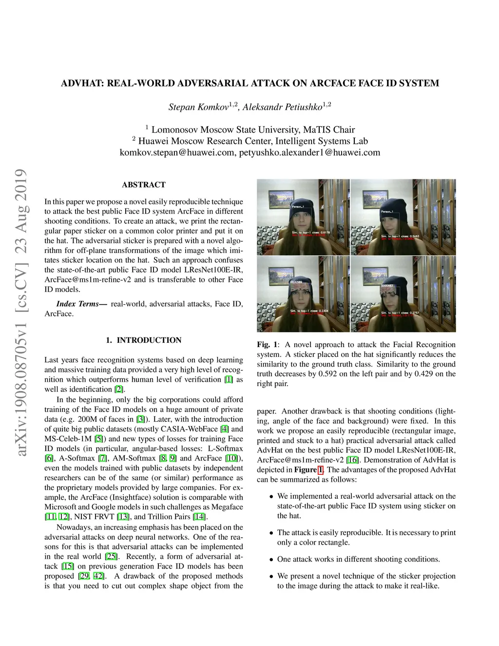 In this paper we propose a novel easily reproducible technique to attack the best public Face ID system ArcFace in different shooting conditions. To create an attack, we print the rectangular paper sticker on a common color printer and put it on the hat. The adversarial sticker is prepared with a novel algorithm for off-plane transformations of the image which imitates sticker location on the hat. Such an approach confuses the state-of-the-art public Face ID model LResNet100E-IR, ArcFace@ms1m-refine-v2 and is transferable to other Face ID models.
