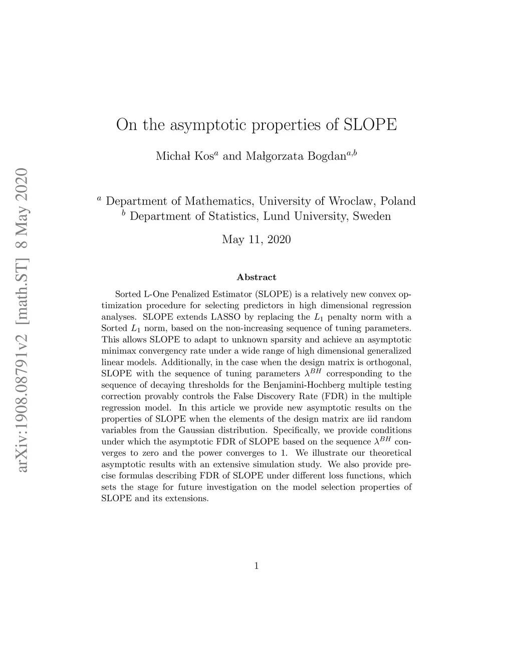 Sorted L-One Penalized Estimator (SLOPE) is a relatively new convex optimization procedure for selecting predictors in large data bases. Contrary to LASSO, SLOPE has been proved to be asymptotically minimax in the context of sparse high-dimensional generalized linear models. Additionally, in case when the design matrix is orthogonal, SLOPE with the sequence of tuning parameters , corresponding to the sequence of decaying thresholds for the Benjamini-Hochberg multiple testing correction, provably controls False Discovery Rate in the multiple regression model. In this article we provide new asymptotic results on the properties of SLOPE when the elements of the design matrix are iid random variables from the Gaussian distribution. Specifically, we provide the conditions, under which the asymptotic FDR of SLOPE based on the sequence converges to zero and the power converges to 1. We illustrate our theoretical asymptotic results with extensive simulation study. We also provide precise formulas describing FDR of SLOPE under different loss functions, which sets the stage for future results on the model selection properties of SLOPE and its extensions.